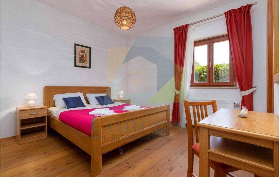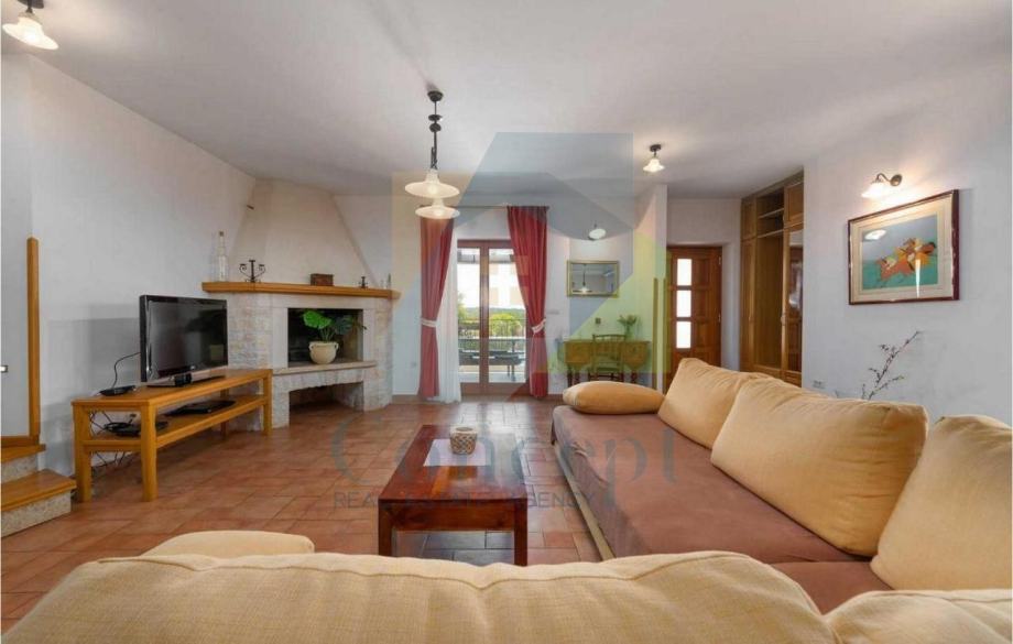 U prizemlju se nalazi prostrani dnevni boravak s kaminom, kuhinja s blagovaonicom, jedna spavaća soba s vlastitom kupaonicom, gostinjski toalet i praktično spremište. Na katu su još dvije spavaće sobe, svaka s privatnom kupaonicom, a iz hodnika se izlazi na terasu s pogledom na more.