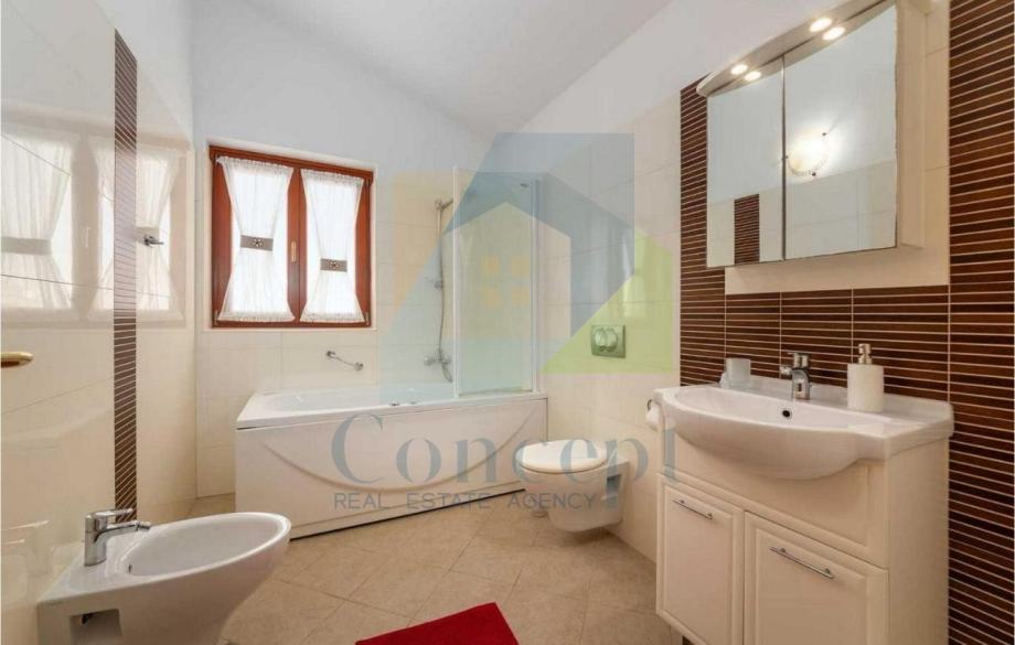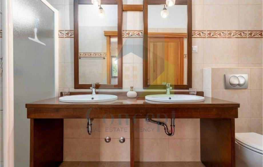 Parcela je ograđena, s električnim portunom i dva parkirna mjesta. Nekretnina se prodaje potpuno namještena i spremna za useljenje, idealna za stalni boravak ili kao luksuzna kuća za odmor i najam.