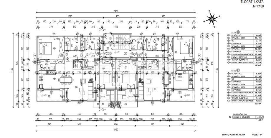 Sastoji se od kuhinje, blagovaone i dnevnog boravka, tri spavaće sobe, dvije kupaonice i wc-a, ostave, balkona i vrta površine cca 40 m2.U stanu je sprovedeno podno grijanje u kupaonici.