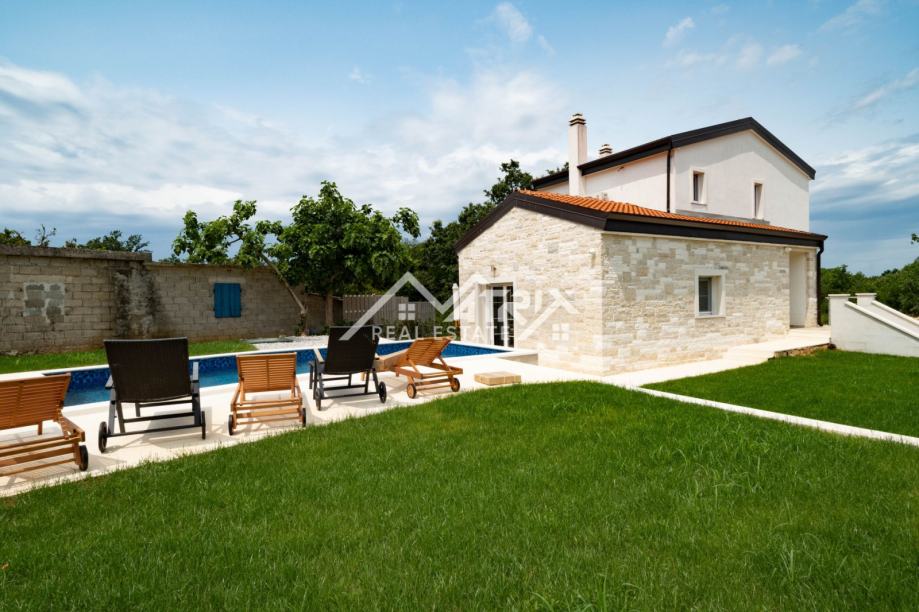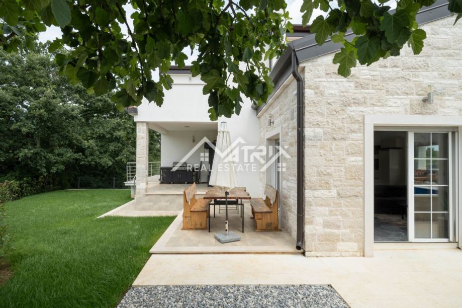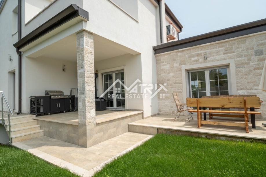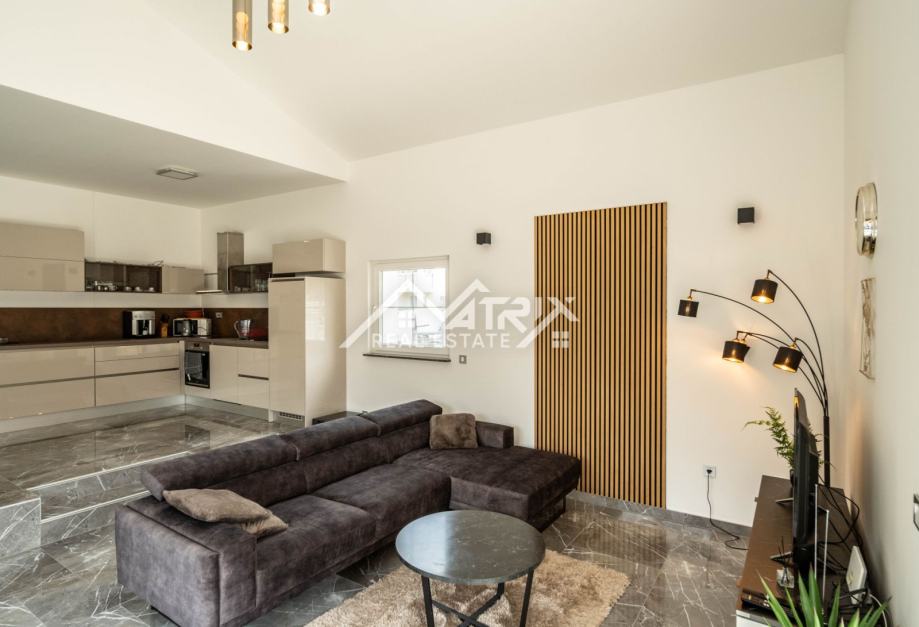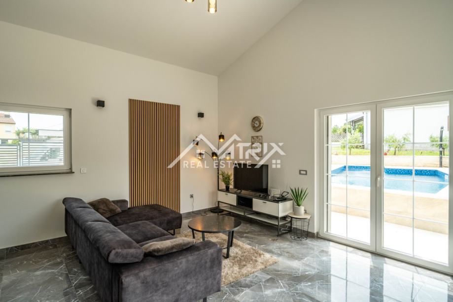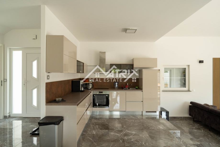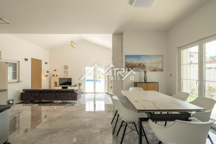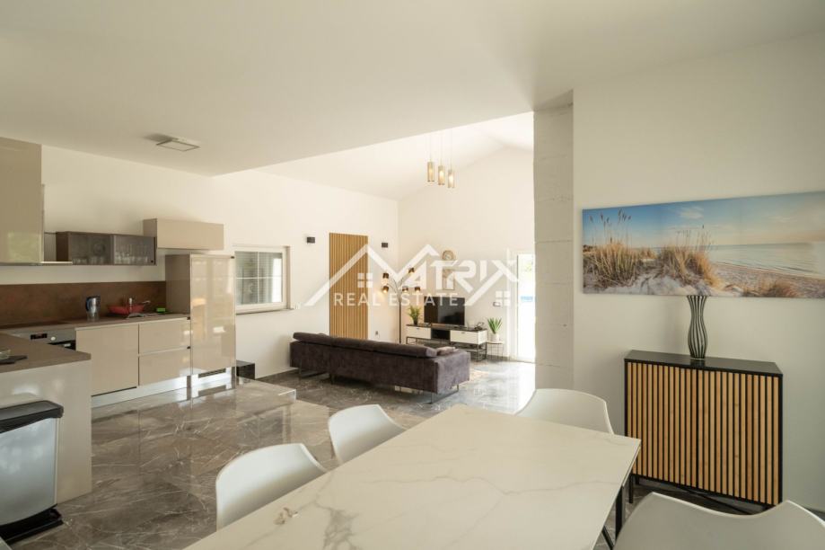U prizemlju se nalazi otvoreni dnevni prostor koji uključuje kuhinju, blagovaonicu i prostrani dnevni boravak, kroz koji se prostiru velike staklene stijene – osiguravajući obilje prirodnog svjetla tijekom cijelog dana. Iz dnevnog prostora izlazi se na natkrivenu terasu, idealnu za druženja, s već postavljenom ljetnom kuhinjom. U sklopu prostrane okućnice nalazi se bazen s uređenim sunčalištem, stvarajući savršen prostor za opuštanje.