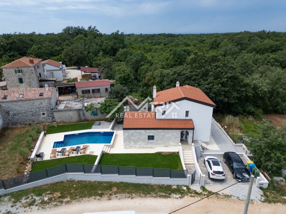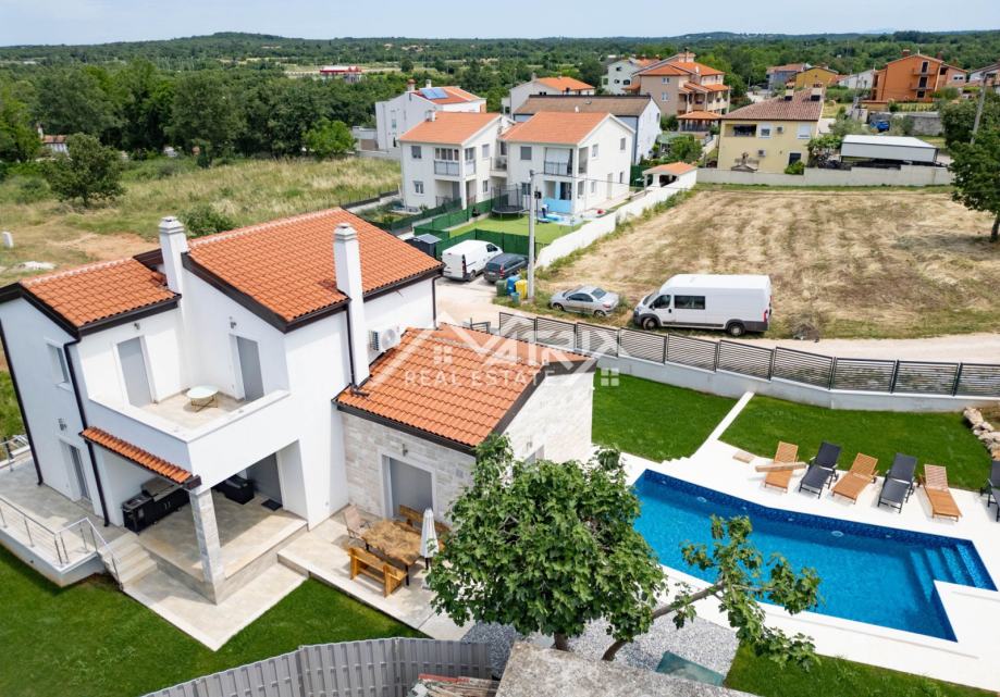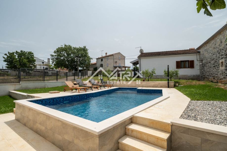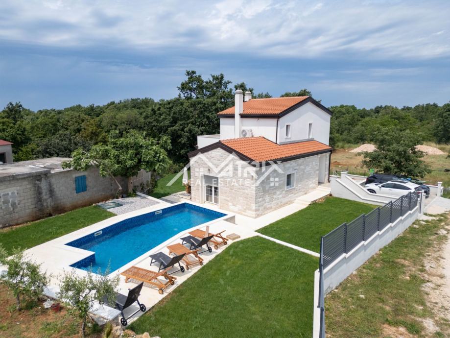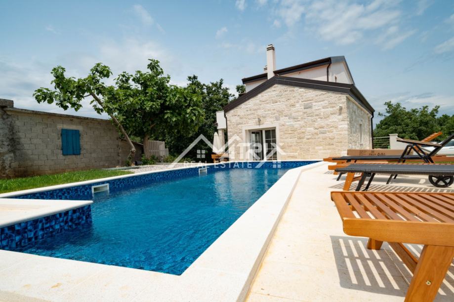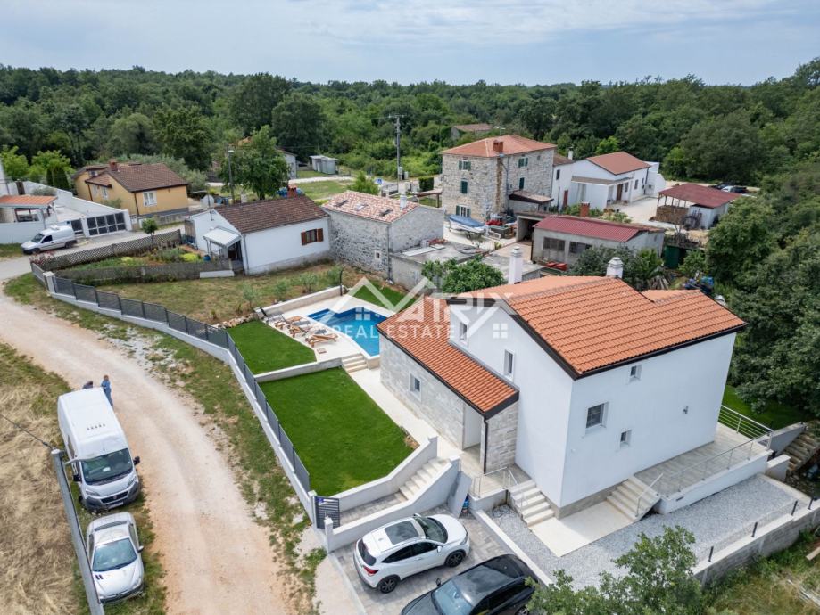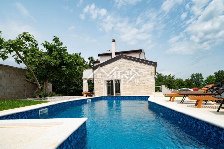 U prizemlju se nalazi otvoreni dnevni prostor koji uključuje kuhinju, blagovaonicu i prostrani dnevni boravak, kroz koji se prostiru velike staklene stijene – osiguravajući obilje prirodnog svjetla tijekom cijelog dana. Iz dnevnog prostora izlazi se na natkrivenu terasu, idealnu za druženja, s već postavljenom ljetnom kuhinjom. U sklopu prostrane okućnice nalazi se bazen s uređenim sunčalištem, stvarajući savršen prostor za opuštanje.