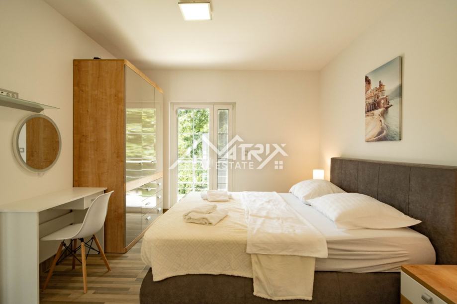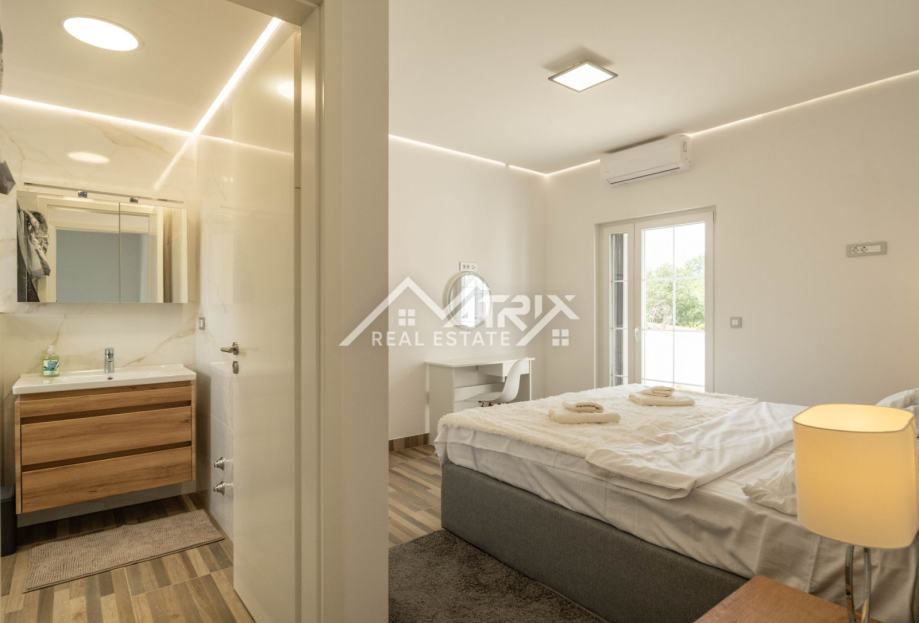 Na gornjoj etaži, do koje se dolazi unutarnjim stubištem, nalaze se još dvije prostrane spavaće sobe. Svaka ima svoju kupaonicu, a obje sobe dijele zajedničku terasu s pogledom na dvorište.