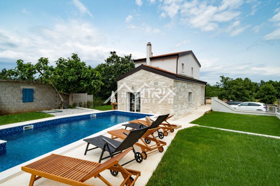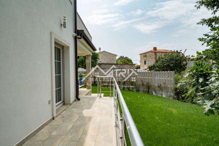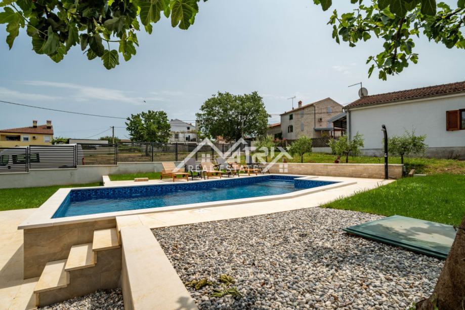 Na mirnoj lokaciji u okolici Poreča, na zemljištu površine 727 m², smjestila se ova lijepo uređena kuća koja se prostire na ukupno 142 m² stambenog prostora raspoređenog na dvije etaže.