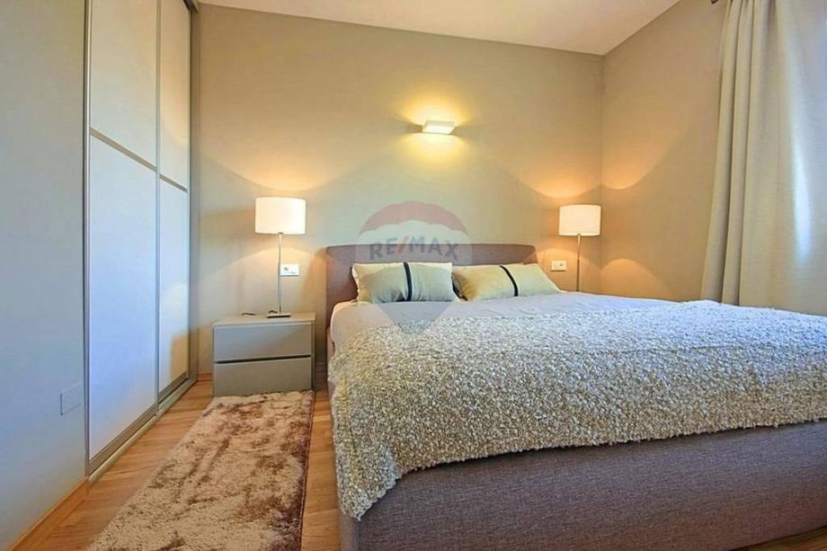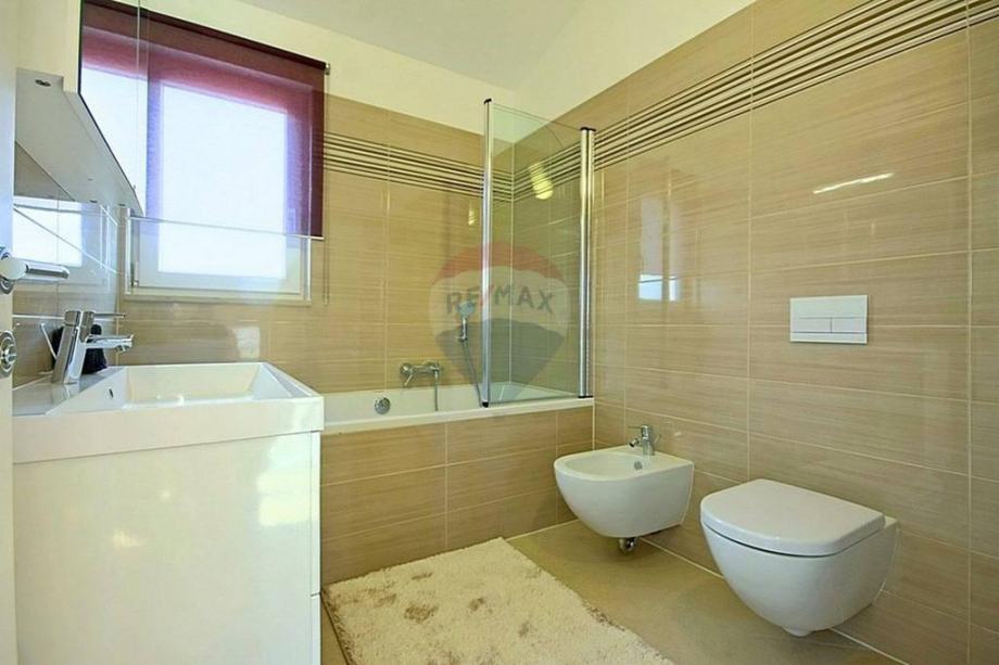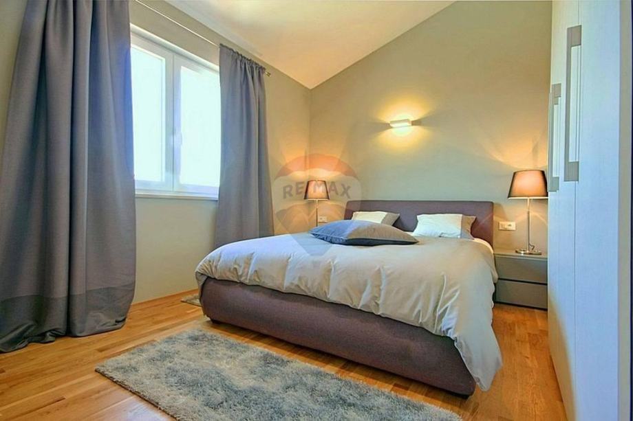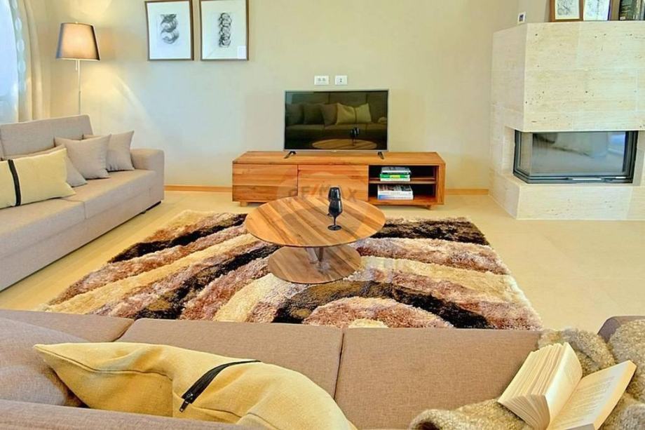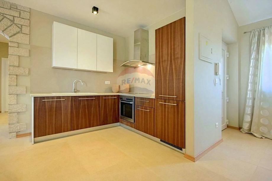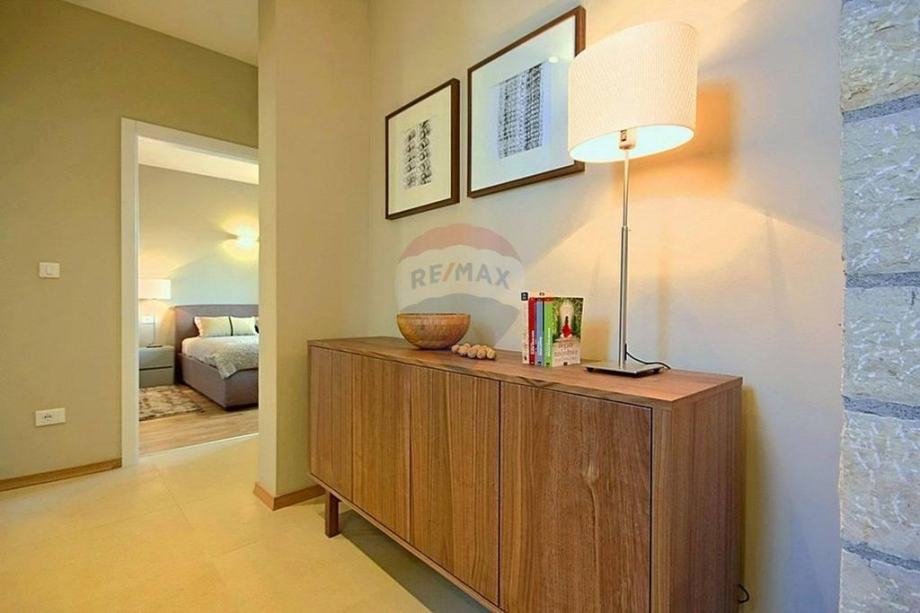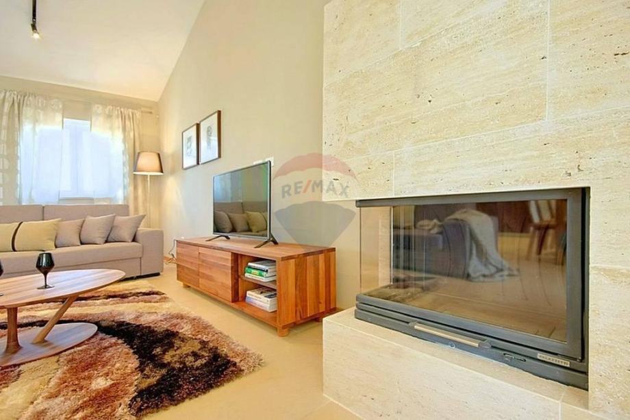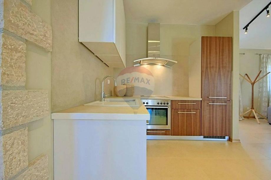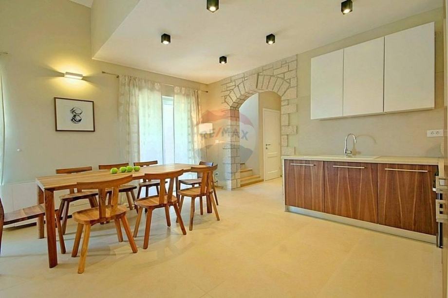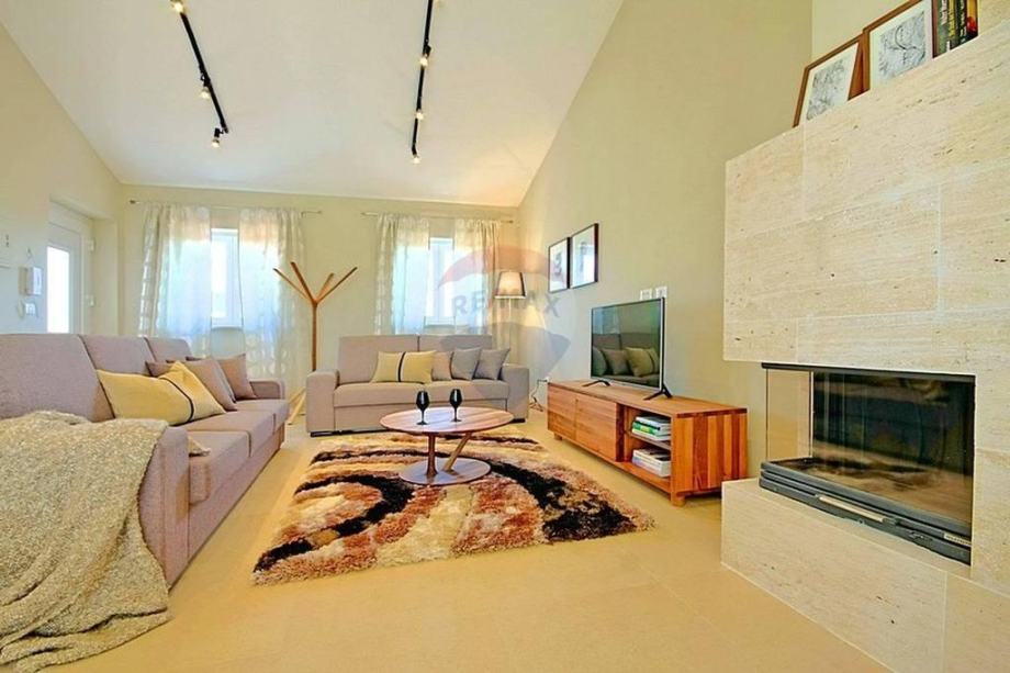 U prizemlju se nalazi prostrani i moderni dnevni boravak s izlazom na terasu i okućnicu, otvorena i kompletno opremljena kuhinja, blagovaona, dvije spavaće sobe i kupaona. Na katu se nalaze još dvije spavaće sobe, kupaona i otvorena terasa prekrasnog pogleda.