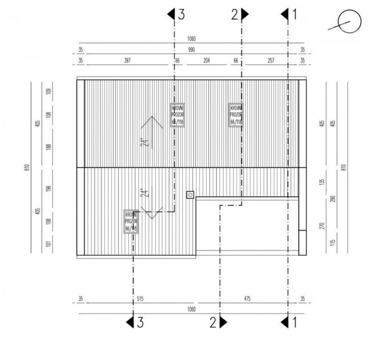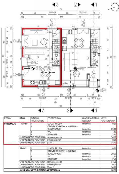 Kuća se sastoji od ukupno tri etaže. U prizemlju se nalazi ulazni hodnik, dnevni boravak sa kuhinjom i blagovaonom u open space stilu, mali toalet i stubište koje vodi na gornji kat.
