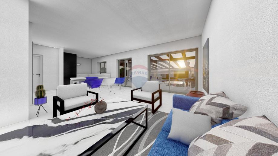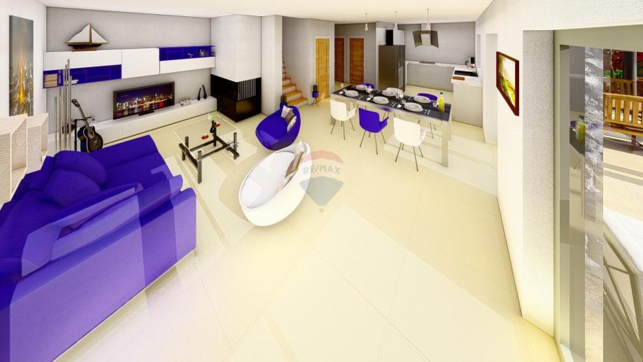 Prizemlje se sastoji od ulaznog trijema, hodnika, dva spremišta, ostave, toaleta, kuhinje s blagovaonom, velikog dnevnog boravka s kaminom, izlazom na terasu.