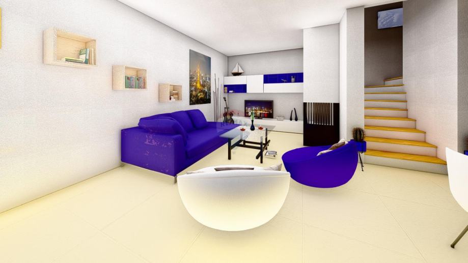 Prizemlje se sastoji od ulaznog trijema, hodnika, dva spremišta, ostave, toaleta, kuhinje s blagovaonom, velikog dnevnog boravka s kaminom, izlazom na terasu.