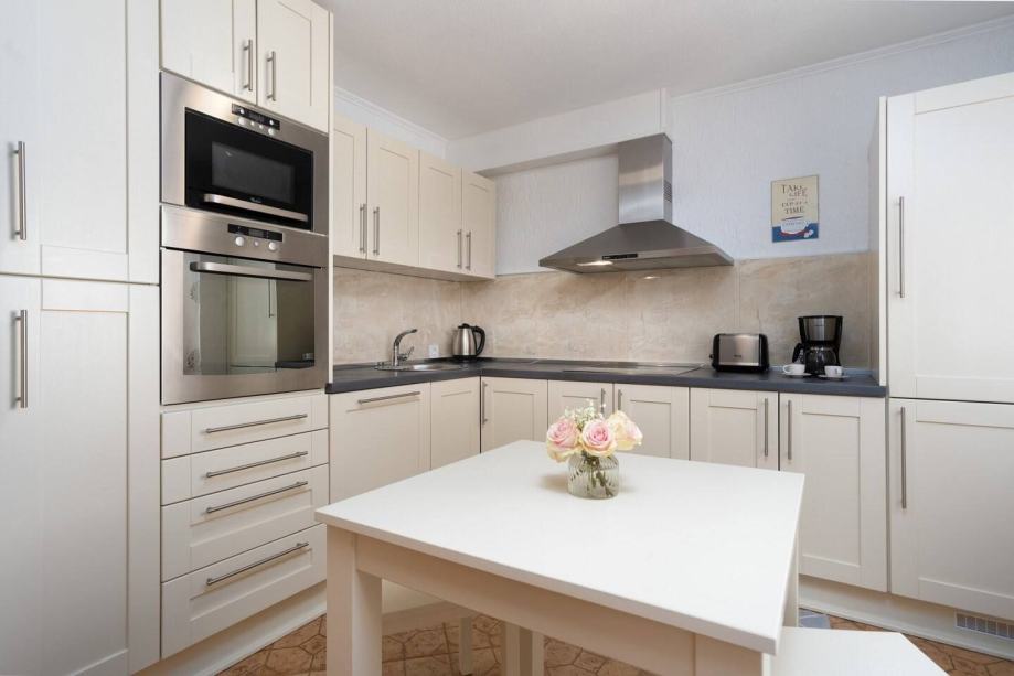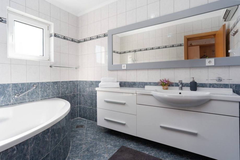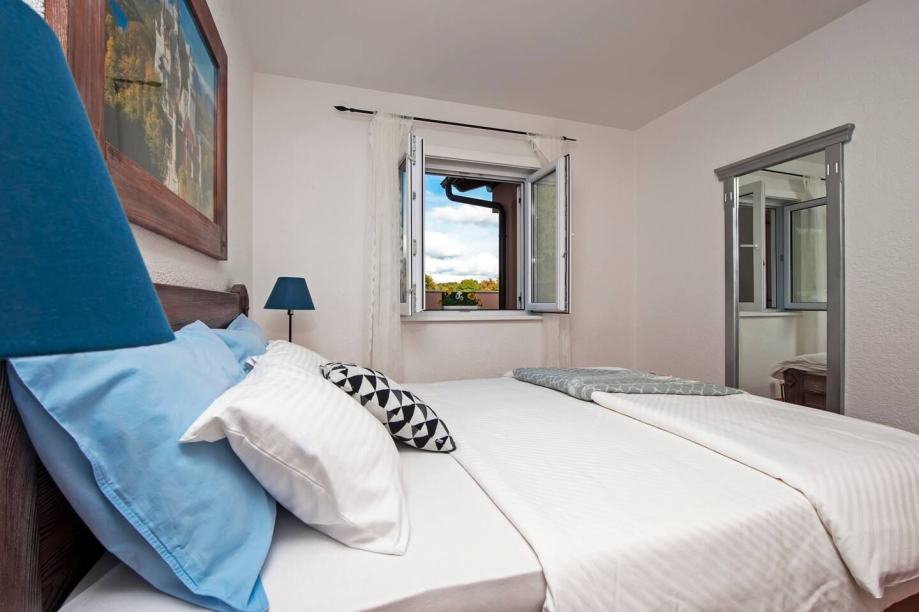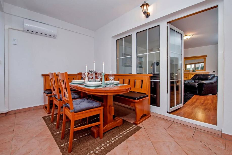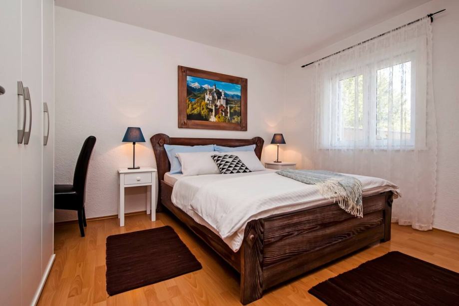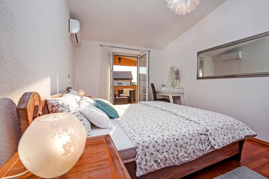 Ispred kuće se nalazi ljetna kuhinja. U prizemlju kuće se nalazi predsoblje , prostrani dnevni boravak, potpuno opremljena kuhinja, dnevni boravak, spavaća soba i kupaonica .Preostale tri spavaće sobe, kupatilo i toalet nalaze se na prvom katu. Spavaće sobe imaju izlaz na prostranu terasu.