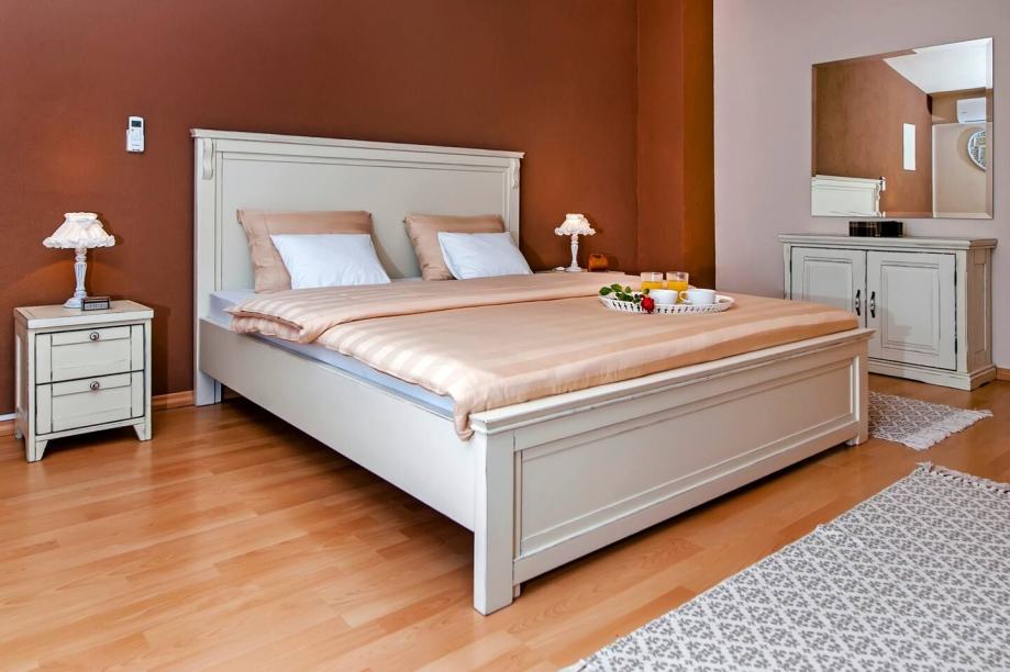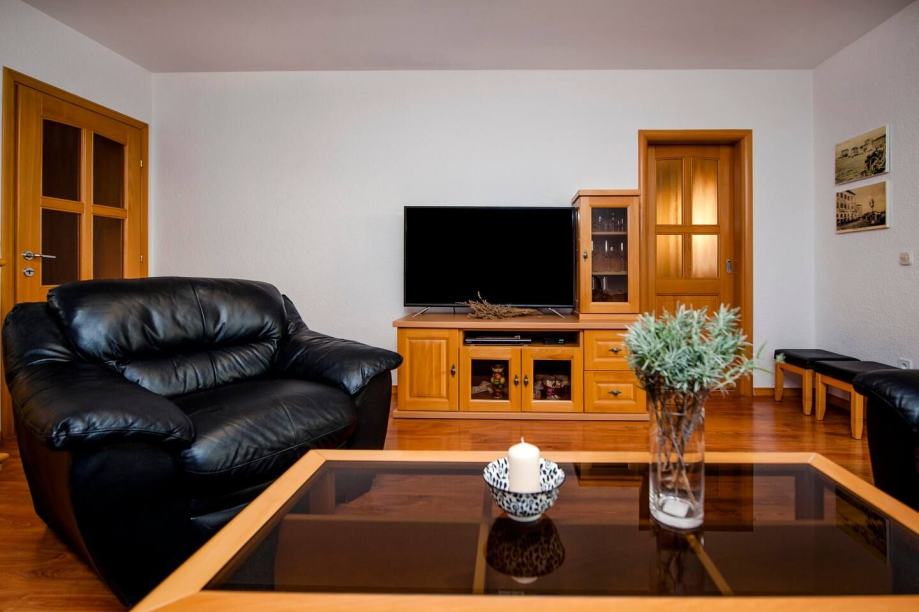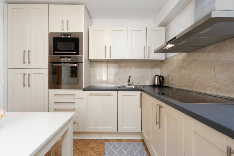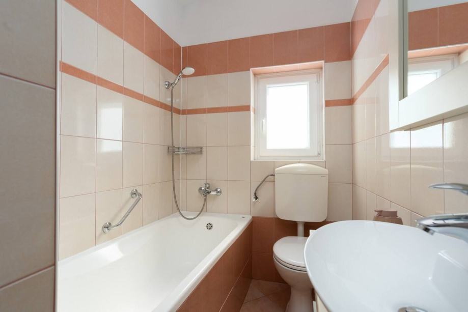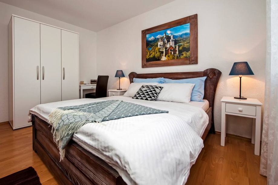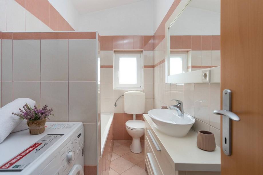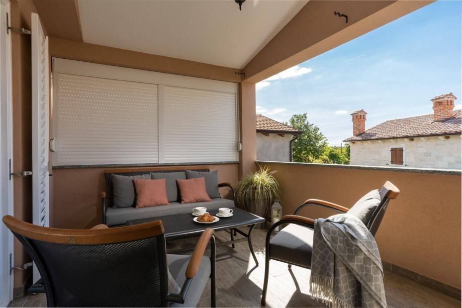 Ispred kuće se nalazi ljetna kuhinja. U prizemlju kuće se nalazi predsoblje , prostrani dnevni boravak, potpuno opremljena kuhinja, dnevni boravak, spavaća soba i kupaonica .Preostale tri spavaće sobe, kupatilo i toalet nalaze se na prvom katu. Spavaće sobe imaju izlaz na prostranu terasu.