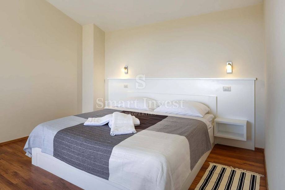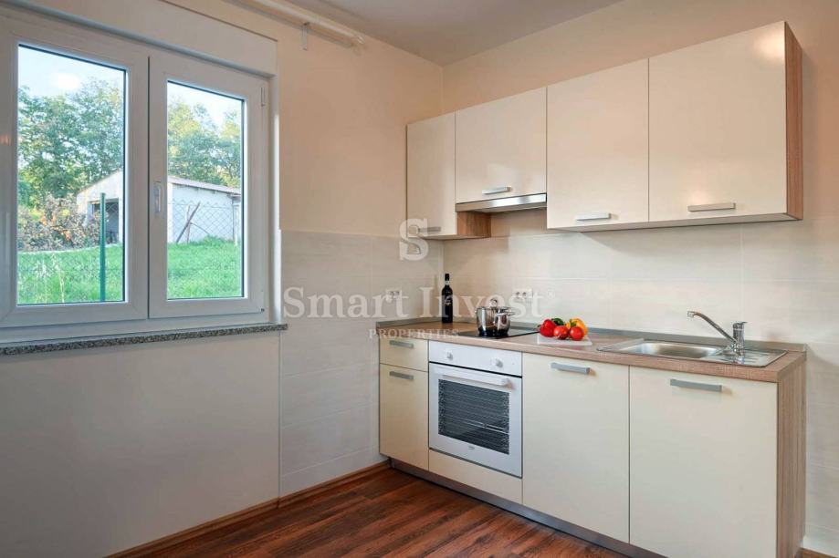 U prizemlju se nalazi prostrani dnevni boravak s kuhinjom i blagovaonom te izlazom na natkrivenu terasu, kupaonica. Na prvom katu se nalaze tri spavaće sobe od kojih jedna ima izlaz na balkon s panoramskim pogledom na more, kupaonica i hodnik. Grijanje/hlađenje na klimu, ENC B. Kategorizirana s 4 zvjezdice za turističko iznajmljivanje.