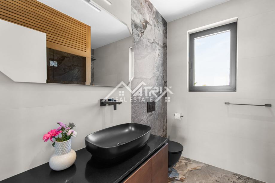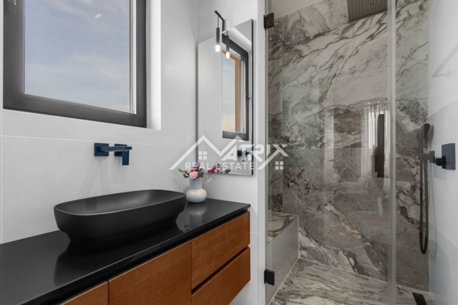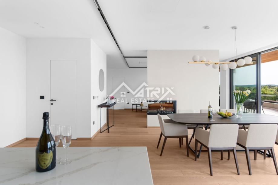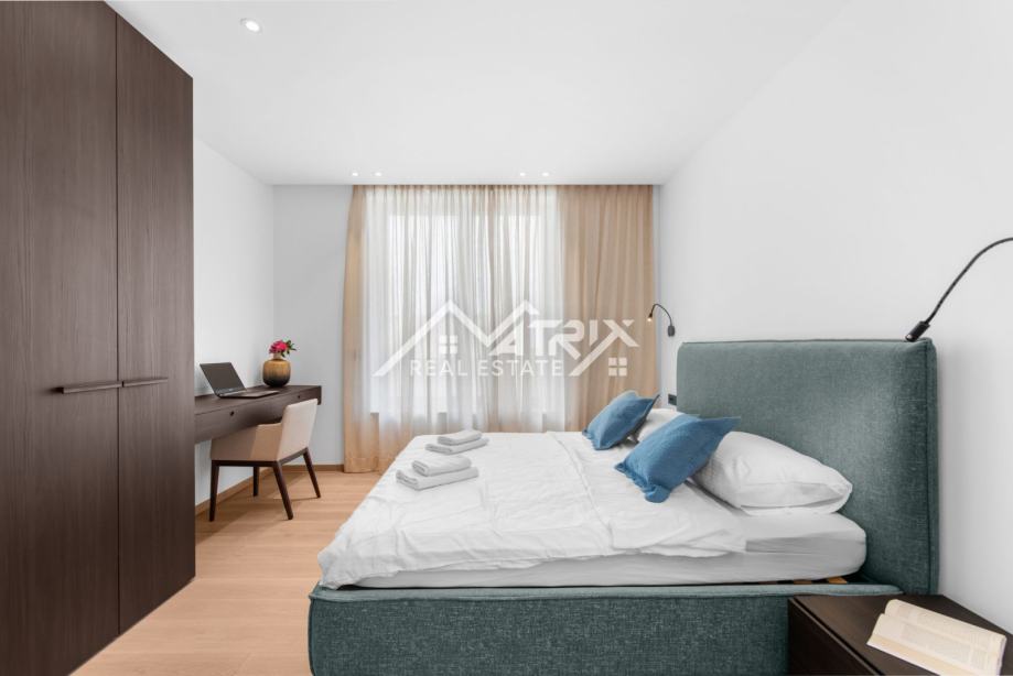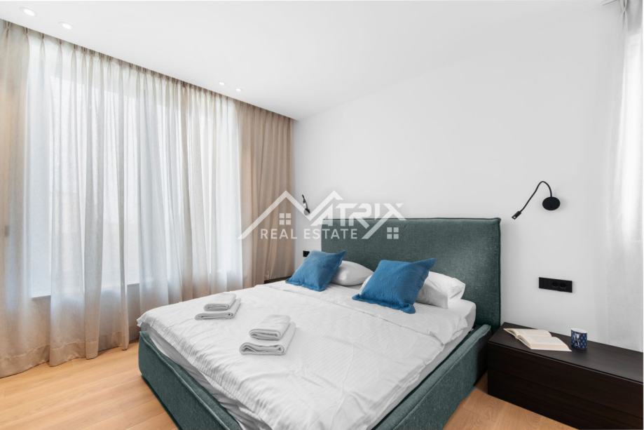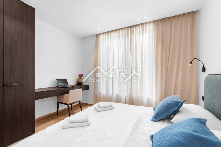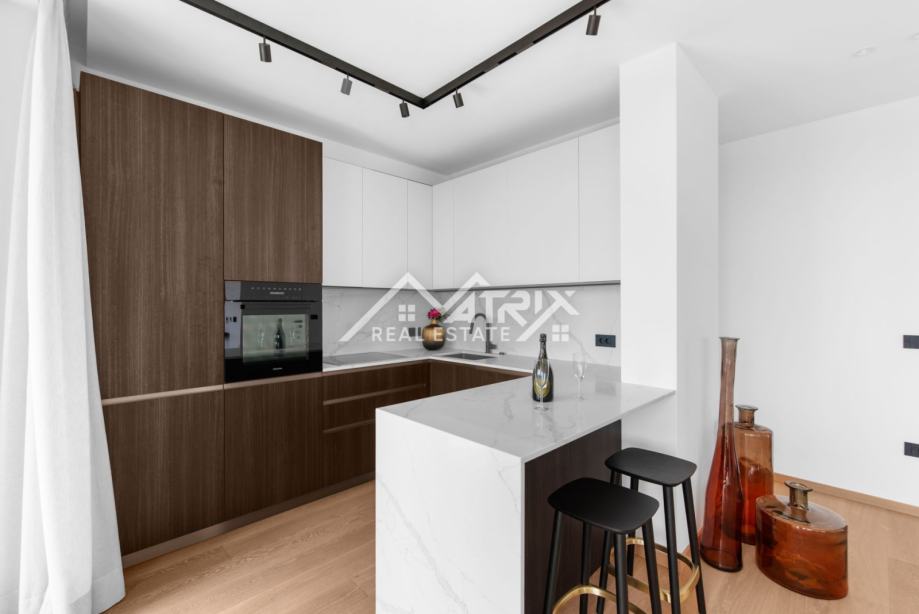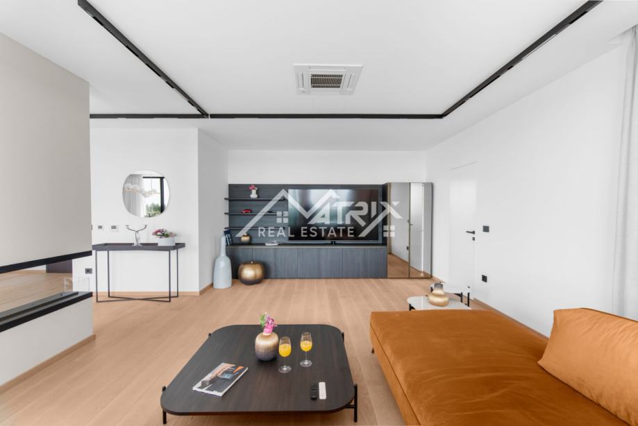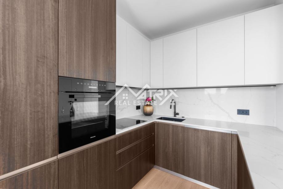 Ekskluzivni interijer opremljen je talijanskim dizajnerskim namještajem, premium Miele uređajima i vrhunskom Hansgrohe sanitarijom (serija Metropol). Ormari Novamobili, s ambijentalnom rasvjetom i soft close zatvaranjem, dodatno naglašavaju sofisticiranost prostora.
