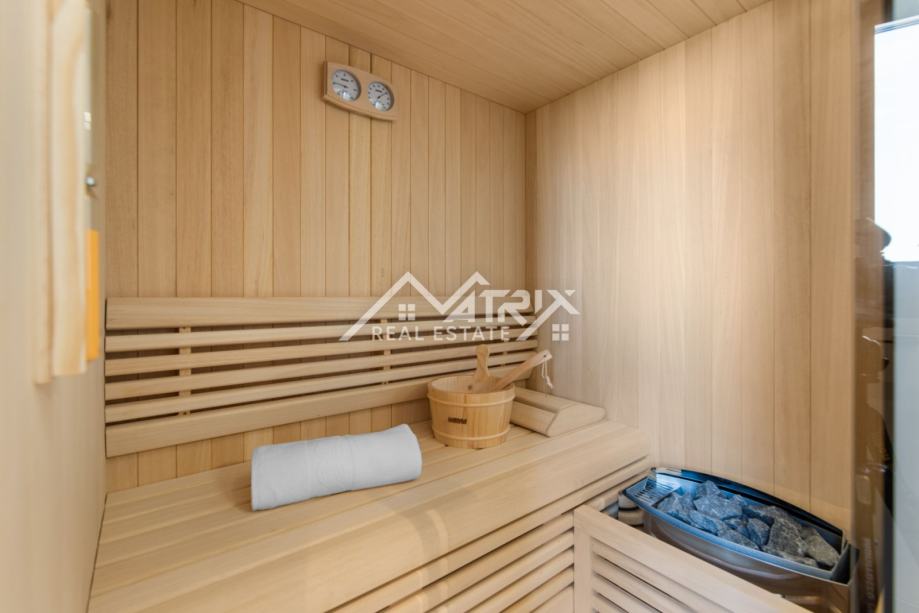 Za potpuni ugođaj i opuštanje, u master spavaćoj sobi nalazi se privatna sauna, dok na prostranoj terasi možete uživati u jacuzziju s pogledom na okolnu prirodu. Dnevni boravak dodatno oplemenjuje kamin na bioetanol, stvarajući topao i elegantan ambijent.