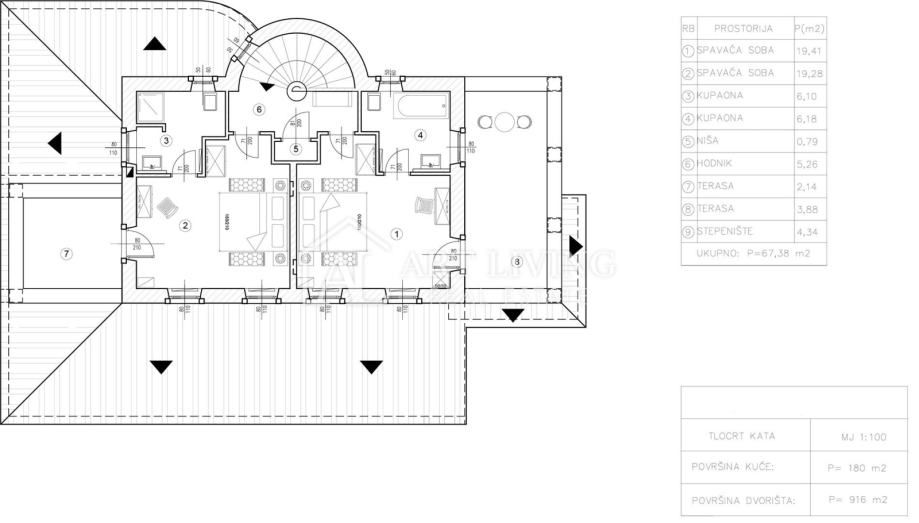 Villa se proteže na dvije etaže, prizemlje i kat, ukupne površine 212 m2 (NKP 180 m2)