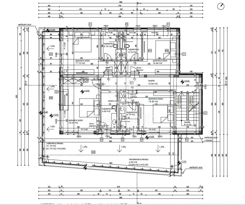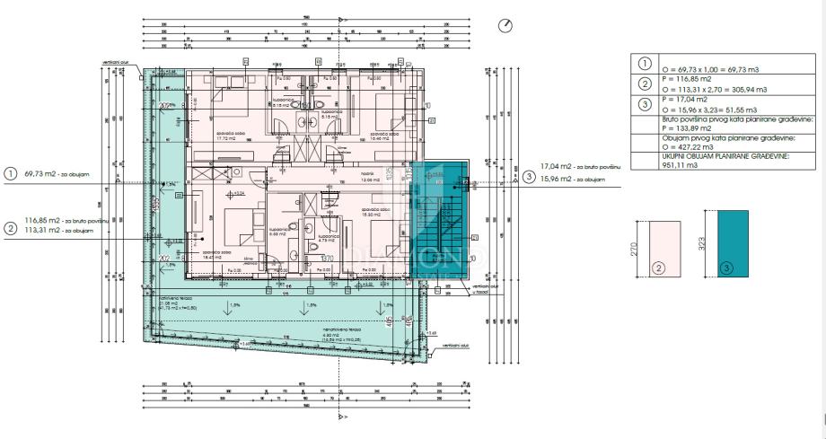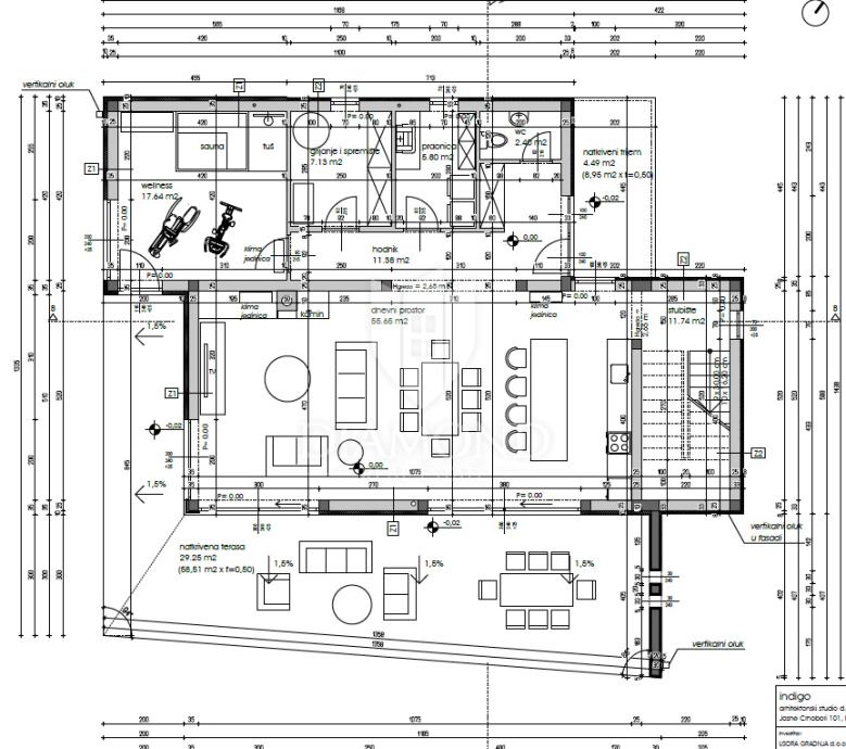 Iz dnevnog boravka i blagovaone se izlazi direktno na natkrivenu terasu gdje se nalazi bazen koji pruža pogled na zelenilo, mir i tišinu. Na krovu ove prekrasne vile se nalazi prostrana terasa od 25.64 m2. koja pruža poseban pogled na more.