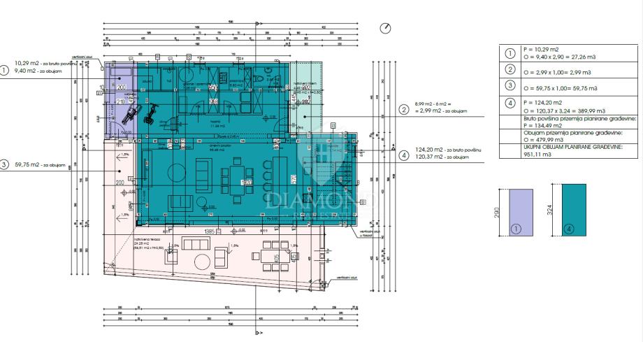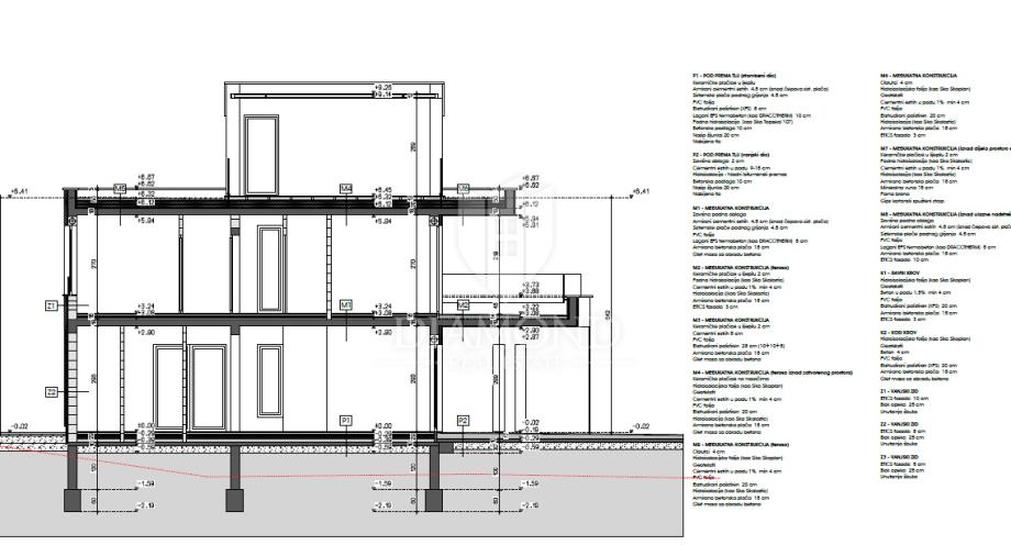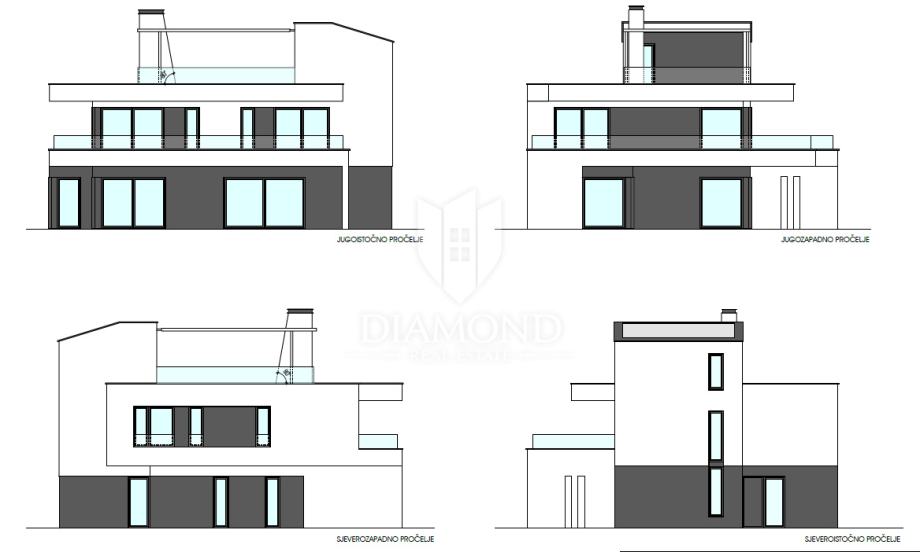 Vila prostire na dvije etaže i veličine je 306.03 m2. Vila se sastoji od prostranog dnevnog boravak koji je po open space konceptu spojen sa kuhinjom i blagovaonom. Kroz cijeli dnevni boravak i blagovaonu ugrađene su velike staklene stijene koje omogućavaju veliki dotok sunčanih zraka što daje samom prostoru veliki izvor svijetlosti, saunu i wellness kutak za uživanje, tehničku sobu, praonicu i wc. Unutarnjim se stubištem dođe na prvi kat gdje se nalaze četiri komforne spavaće sobe, svaka sa vlastitom kupaonom i terasom sa pogledom na more.