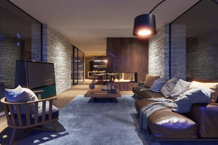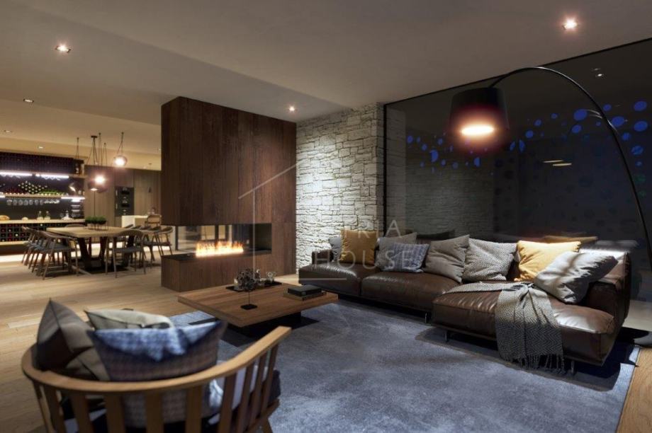 Villa ima ukupno 270 m2 i proteže se na dvije etaže, a nalazi se na velikom zemljištu od približno 1500 m2 što je idealna veličina za tako prekrasnu villu jer daje dovoljno prostora i privatnosti. U prizemlju se nalazi otvoreni dnevni boravak koji se spaja sa luksuznom kuhinjom i hlagovaonom. Iz dnevnog boravka se izlazi na natkrivenu terasu koja u načelu funkcionira kao produžetak dnevnog boravka te tako veliki prostor čini još većim. Taj efekt je još više povećan jer su prisutne staklene stijene koje još više otvaraju prostor. Na prvom katu ville se nalaze četiri spavaće sobe svaka sa svojim vlastitim kupatilom te izlazom na ogromnu terasu s koje se pruža prekrasan pogled na more, a po lijepom vremenu se vide i Alpe.