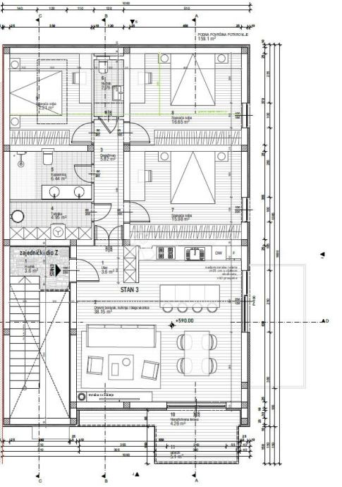 Veličina korisne površine stana je 115,92m2 (NKP 108,89m2)., što znači da imate 9.36m2 samo terase.