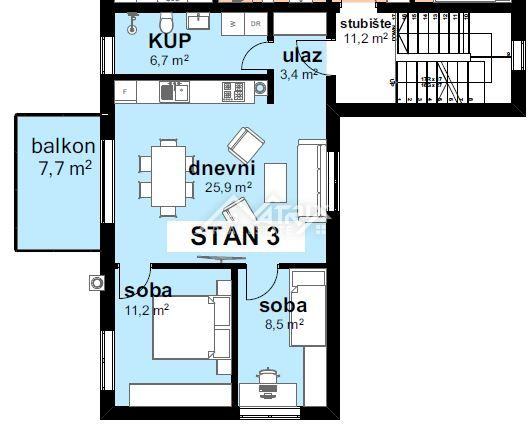 Stan se nalazi na prvom katu moderne novogradnje, a sastoji se od ulaznog hodnika, velikog otvorenog prostora koji objedinjuje kuhinju, blagovaonicu i dnevni boravak s izlazom na natkriveni balkon kroz velike staklene stijene koje omogućuju obilje dnevnog prirodnog svjetla kroz cijeli dan. Stan još ima i dvije spavaće sobe, te jednu kupaonicu.