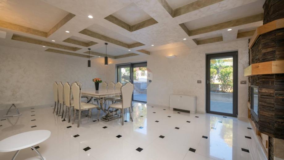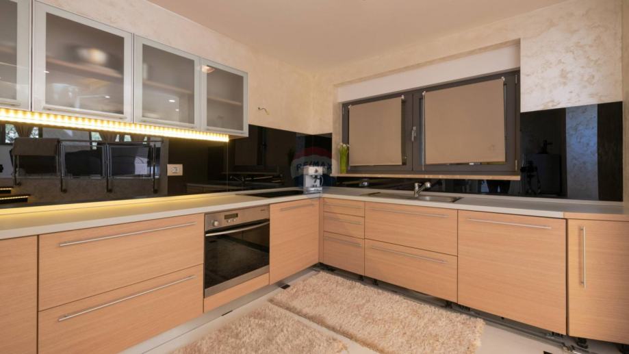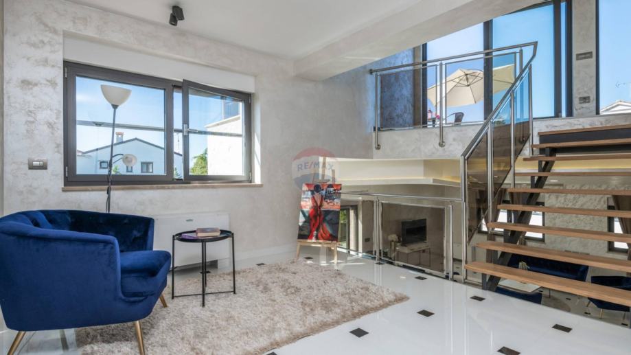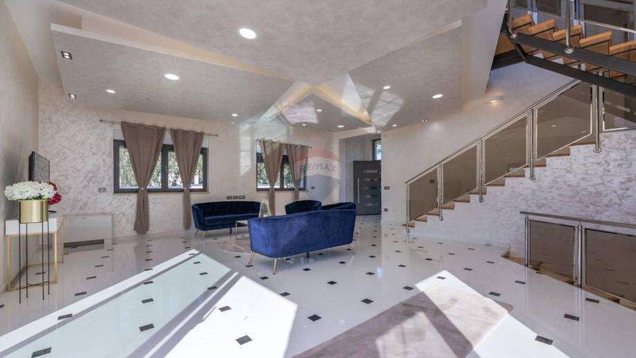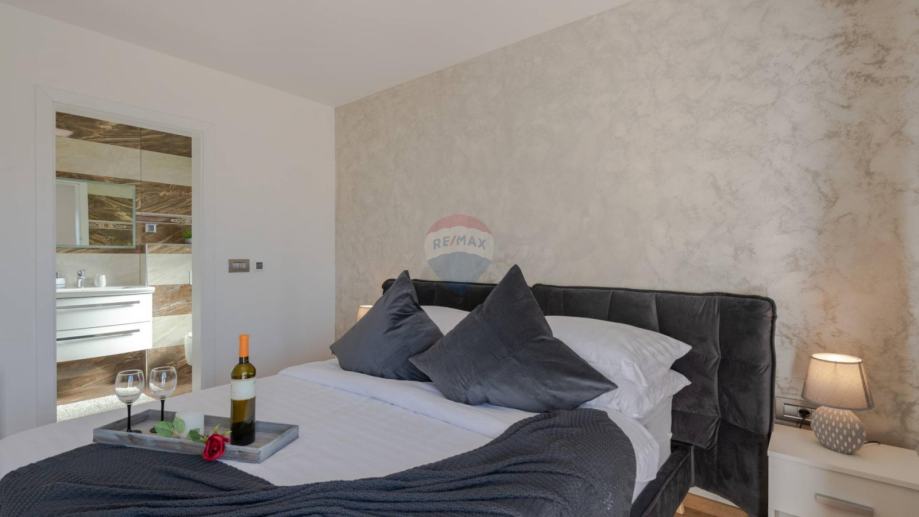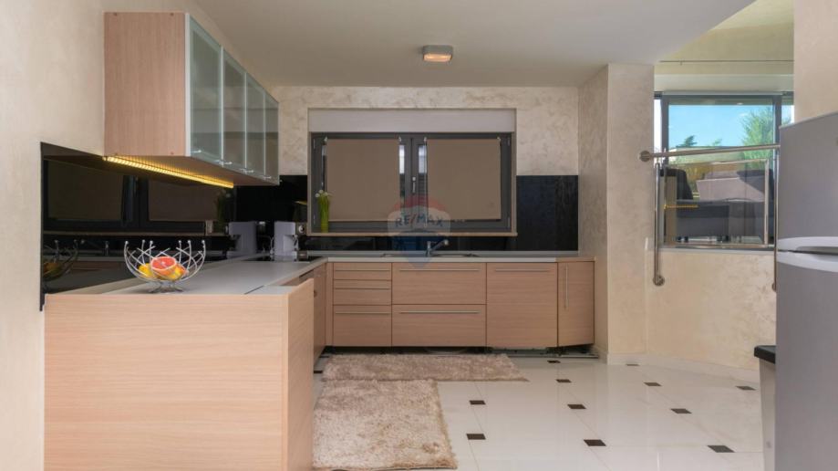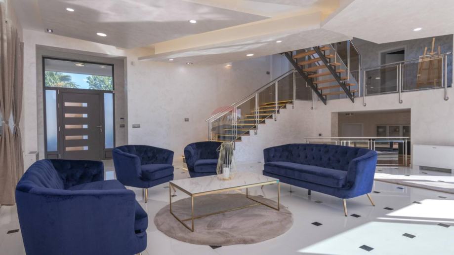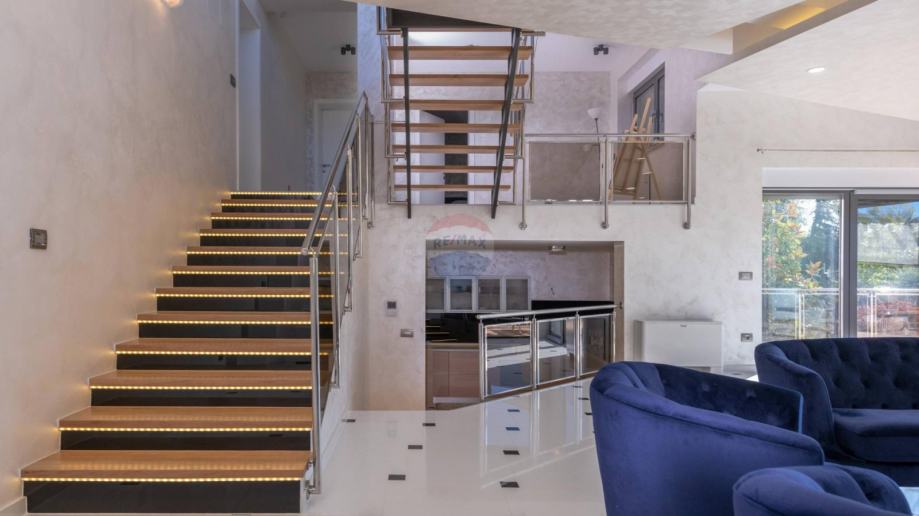 Nalazi se u mirnoj ulici, okružena prirodom, prekrasnog pogleda prema moru. Kuća se prostire na dvije etaže, a osmišljenja je od prizemlja gdje se nalazi, spavaća soba s kupaonom s izlazom na vrt, WC, spremište, kotlovnica, dnevni boravak, kuhinja, blagovaona sve u jednom otvorenom sistemu s staklenim stijenama koje povezuju unutrašnjost kuće s vanjskim prostorom. S obzirom na orijentiranost prema zapadu, kuća je okupana dnevnom svjetlošću i suncem sve do kasnih večernjih sati. Do prvog kata stiže se stepeništem sa staklenom ogradom, vrlo dojmljiva povezanost s katom gdje se nalaze tri spavaće sobe, svaka sa svojom kupaonom i velika terasa s lijepim pogledom na maslinike i more. Poseban dio kuće je ogromna krovna terasa s koje se proteže neponovljivi pogled na more. Kuća je opremljena najsuvremenijim uređajima za grijanje i hlađenje, fan coil sustav s toplinskom pumpom a sve kupaone imaju podno grijanje, opremljena video nadzorom i ima vrhunsku unutarnju i vanjsku rasvjetu. Dvije kupaone osim najkvalitetnijih sanitarija poznatih proizvođača posjeduju i saune.