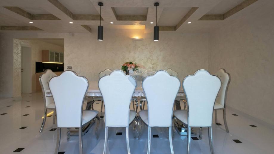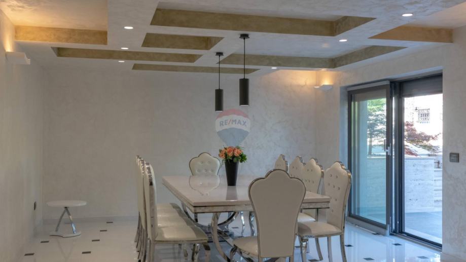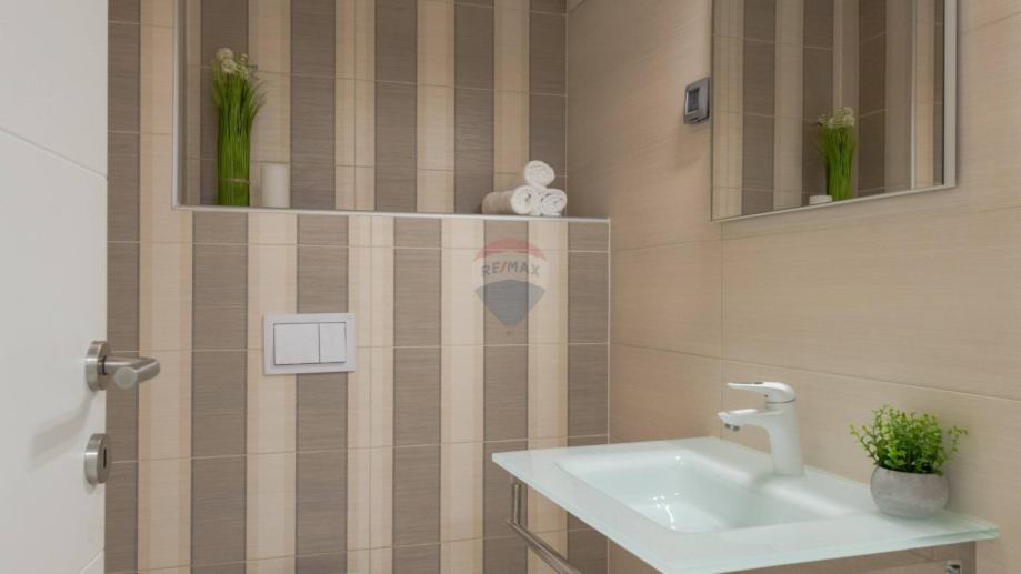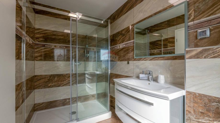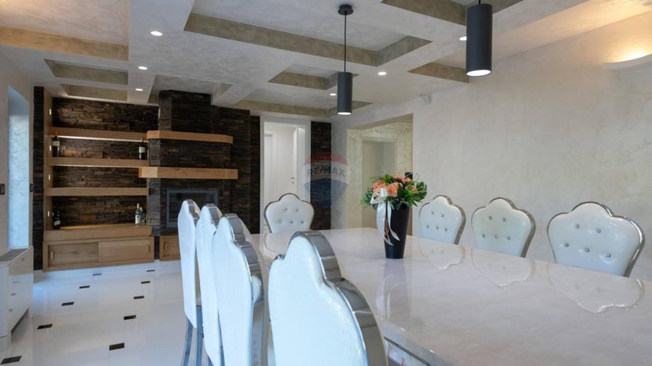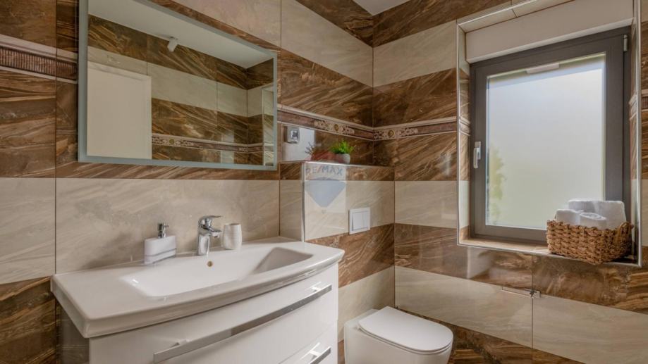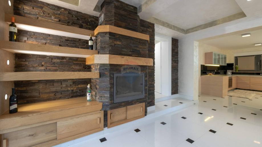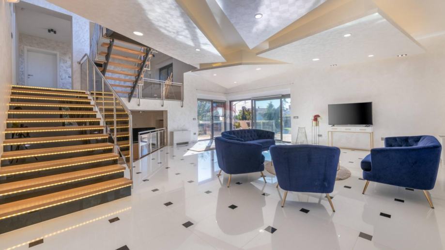 Nalazi se u mirnoj ulici, okružena prirodom, prekrasnog pogleda prema moru. Kuća se prostire na dvije etaže, a osmišljenja je od prizemlja gdje se nalazi, spavaća soba s kupaonom s izlazom na vrt, WC, spremište, kotlovnica, dnevni boravak, kuhinja, blagovaona sve u jednom otvorenom sistemu s staklenim stijenama koje povezuju unutrašnjost kuće s vanjskim prostorom. S obzirom na orijentiranost prema zapadu, kuća je okupana dnevnom svjetlošću i suncem sve do kasnih večernjih sati. Do prvog kata stiže se stepeništem sa staklenom ogradom, vrlo dojmljiva povezanost s katom gdje se nalaze tri spavaće sobe, svaka sa svojom kupaonom i velika terasa s lijepim pogledom na maslinike i more. Poseban dio kuće je ogromna krovna terasa s koje se proteže neponovljivi pogled na more. Kuća je opremljena najsuvremenijim uređajima za grijanje i hlađenje, fan coil sustav s toplinskom pumpom a sve kupaone imaju podno grijanje, opremljena video nadzorom i ima vrhunsku unutarnju i vanjsku rasvjetu. Dvije kupaone osim najkvalitetnijih sanitarija poznatih proizvođača posjeduju i saune.