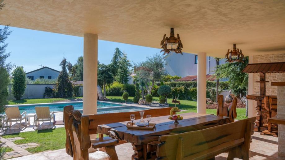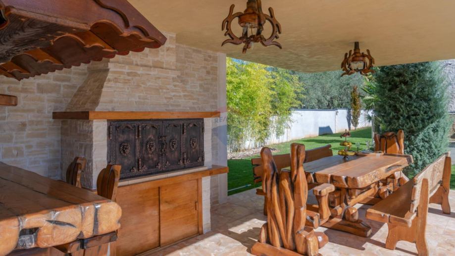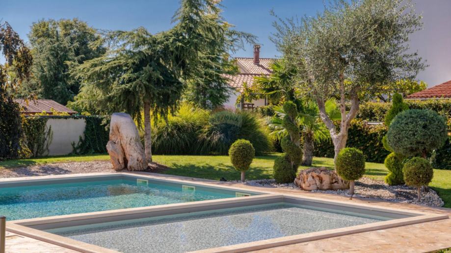 Bazen površine 65 m2 i mali dječji od 16 m2 smješten na južnu stranu kuće okružen sunčalištem i velikom ljetnom kuhinjom s prekrasno uređenom okućnicom i puno mediteranskog i ostalog bilja čini pravu raskoš dojmova.