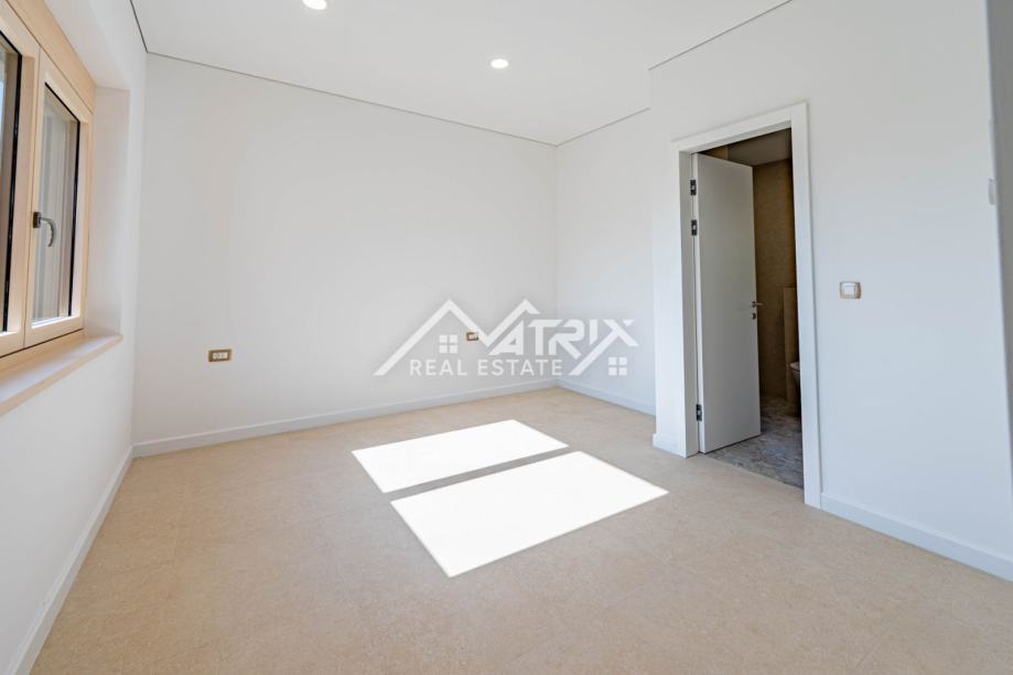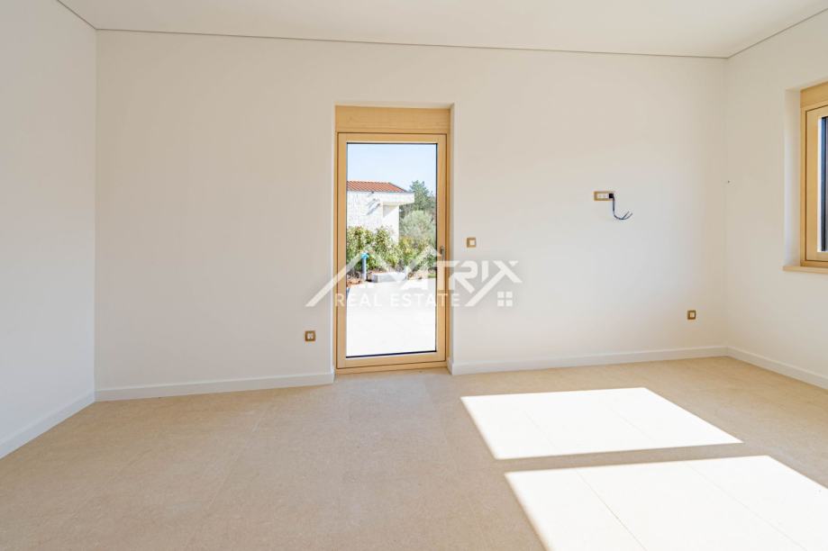 Za cjelogodišnji komfor predviđeno je podno grijanje na dizalicu topline, a dodatnu vrijednost daju kvalitetni detalji opreme: drvo-aluminij stolarija, električne žaluzine i komarnici na svim otvorima. Garaža je opremljena Hörmann garažnim vratima, što naglašava standard i pouzdanost izvedbe.
