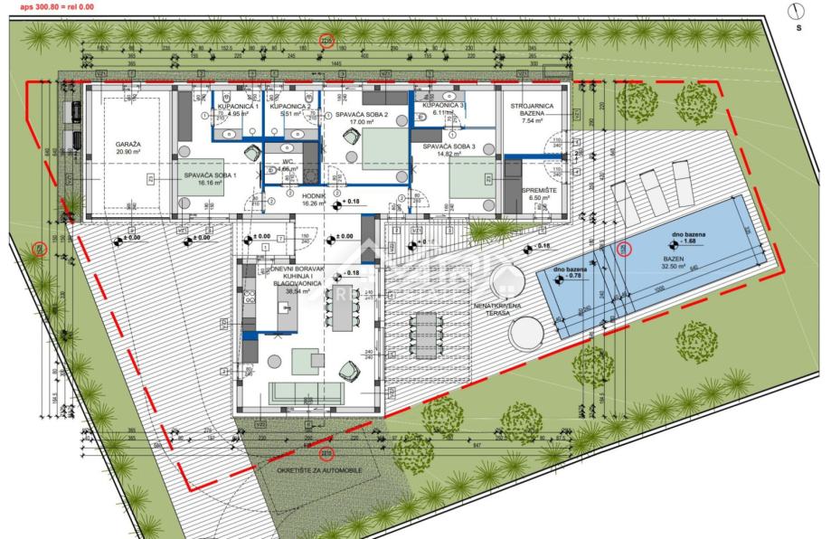 Dnevni dio je osmišljen kao otvoreni koncept s velikim staklenim stijenkama prema terasi i vrtu, što prostoru daje svjetlo i osjećaj širine. Uređena okućnica i velika terasa stvaraju idealnu kulisu za opuštanje i druženja, a posebna prednost je bazen dimenzija približno 3,25 x 10 m (32,50 m²) koji će biti grijan, pa se sezona korištenja znatno produljuje.