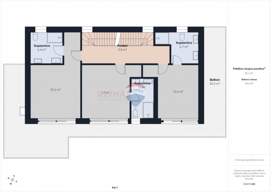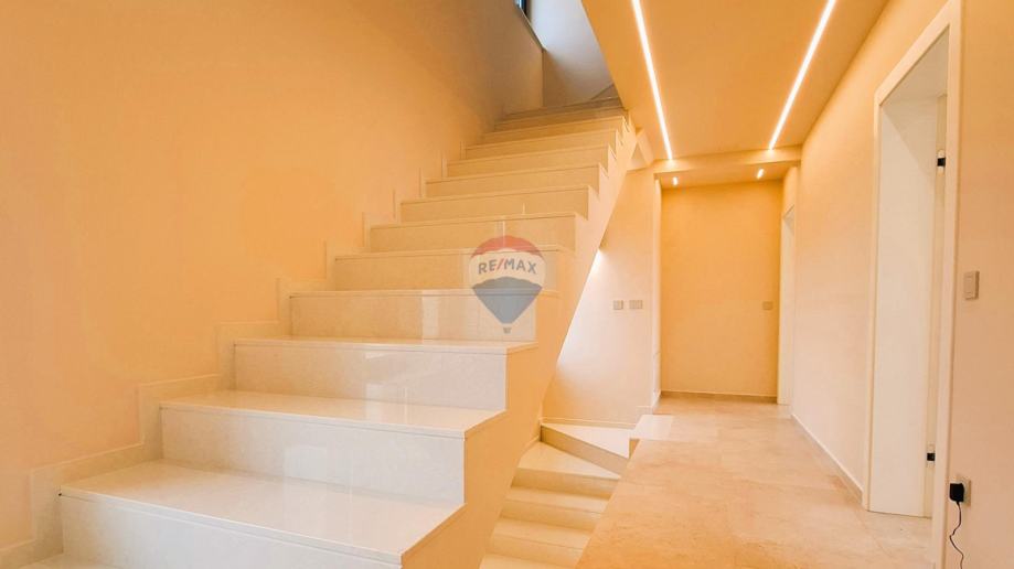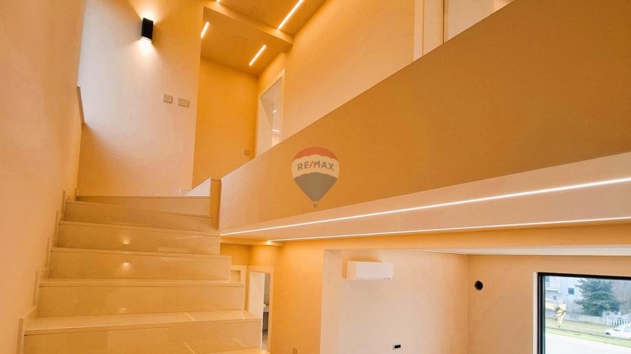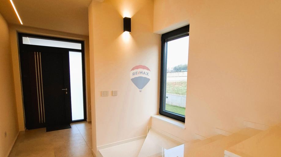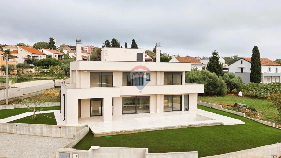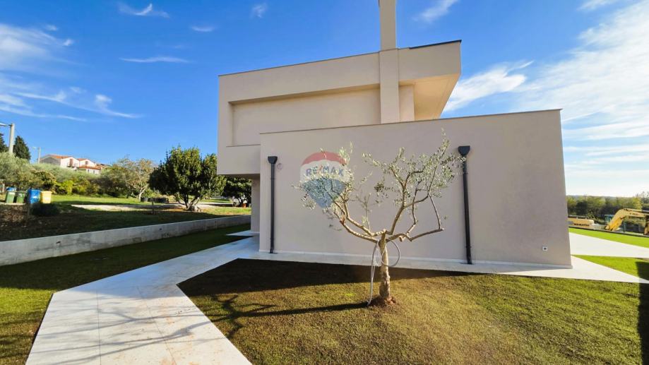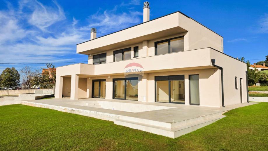 RE/MAX Centar nekretnina predstavlja na mirnoj lokaciji u blizini Poreča, modernu samostojeću obiteljsku kuću s bazenom. Kuća je katnosti P+1 i sastoji se od jedne stambene jedinice koja se prostire kroz dvije etaže, uz dodatnu krovnu terasu. Smještena je na prostranoj građevinskoj čestici površine 821 m², a ukupna bruto površina kuće iznosi 251,80 m². Dodatnu vrijednost nekretnini daje vanjski bazen dimenzija 4 x 9 m, idealan za opuštanje i boravak na otvorenom. Prizemlje kuće obuhvaća natkriveni ulaz s predsobljem, gostinjski WC, praonicu, prostrani dnevni boravak povezan s kuhinjom i blagovaonicom, ostavu, spavaću sobu s garderobom i vlastitom kupaonicom, tehničku prostoriju te natkrivenu terasu s izlazom prema bazenu. Na katu se nalazi predsoblje sa stubištem te tri spavaće sobe, svaka s vlastitom kupaonicom, kao i natkrivena i nenatkrivena terasa. Na krovu kuće smještena je prostrana krovna terasa s pristupnim stubištem, s pripremom za nadstrešnicu, saunu i jacuzzi (uređaji nisu uključeni u cijenu). Građevina je izgrađena od kvalitetnih i trajnih materijala, u skladu s važećim propisima. Konstrukciju čine armiranobetonski temelji i međukatne ploče te nosivi zidovi s toplinskom izolacijom.