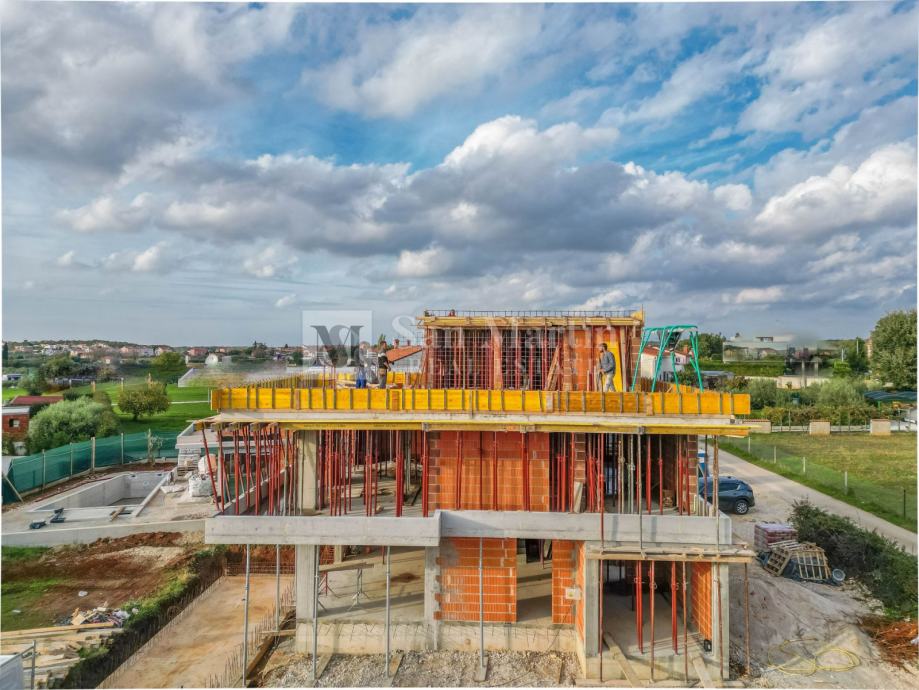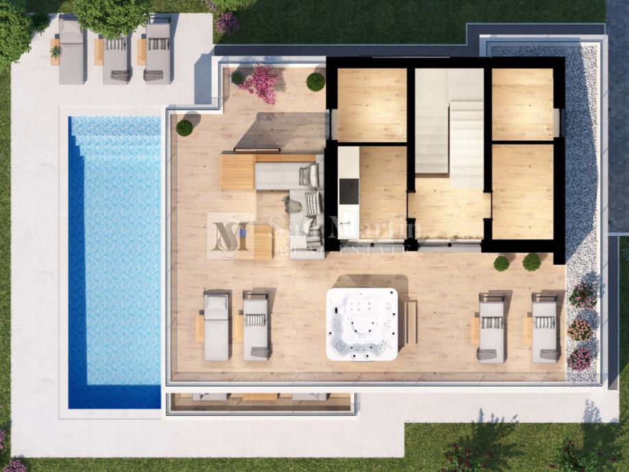 Na samo par minuta od centra Poreča i mora prodaje se ova moderna vila s bazenom u izgradnji. U prizemlju kuće nalazi se prostrani dnevni dio s blagovaonicom, kuhinjom i dnevnim boravkom koji je staklenim stijenama povezan s vrtom i velikim bazenom. Tu se još nalazi i soba za wellness, kupaonica i tehnička soba odnosno ostava.