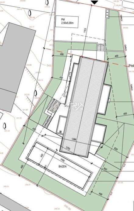 Centralni dio prostrane okućnice je veliki grijani bazen sa sunčalištem, površine 56 m2, koji će vam omogućiti uživanje u vodi tijekom cijele godine. Bazen će biti opremljen suvremenim sustavima filtracije i grijanja kako bi se osigurala najviša kvaliteta vode. U sklopu okućnice nalazi se i popločeni prostor koji se koristi kao parking za više vozila. Okućnica je potpuno ograđena, pružajući potpuni osjećaj privatnosti.