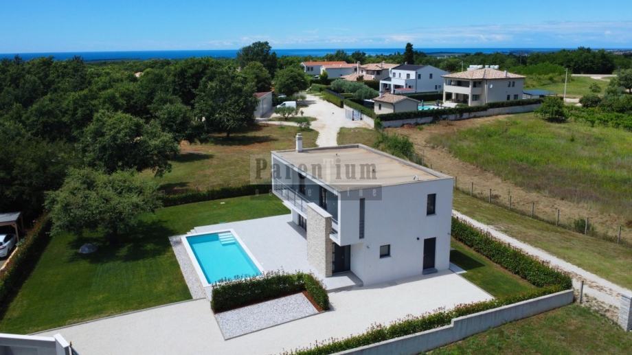 Prekrasna moderna samostojeća vila s bazenom i velikom okućnicom, okružena zelenilom i prirodom u mirnoj ulici skrivena od gradske vreve i buke, a samo nekoliko minuta vožnje autom udaljena od grada Poreča.