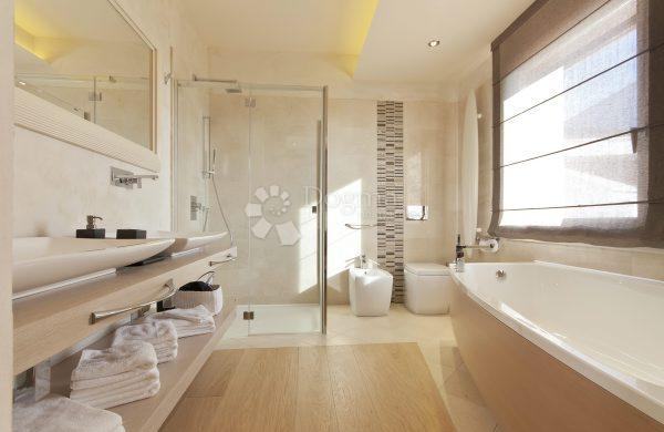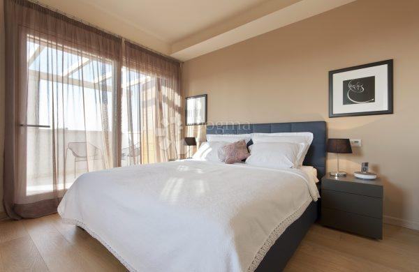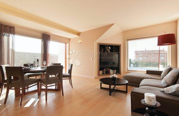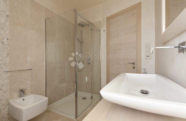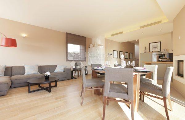 Vila je podijeljena na 2 etaže i sastoji se od ulaznog prostora, open space dnevnog boravka s kuhinjom i blagovaonom, 3 spavaće sobe, od kojih 2 imaju vlastite kupaonice, garderobe i terase uz još jednu dodatnu kupaonicu u prizemlju. Vila je opremljena centralnim grijanjem kao i klima uređajima za grijanje i hlađenje te kaminom u dnevnom boravku.U lijepo uređenom i održavanom dvorištu se nalazi bazen od 35 m2 sa sunčalištem, ljetna terasa i garaža koja je spojena uz kuću.