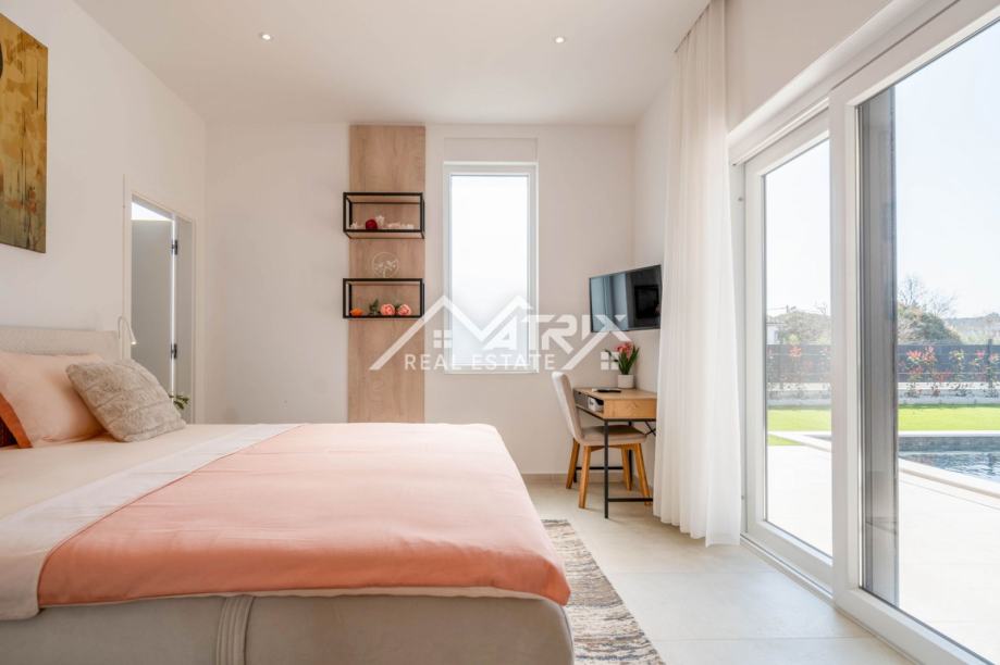 Prizemlje ove očaravajuće vile nudi moderan otvoreni prostor koji obuhvaća dnevni boravak, blagovaonicu i kuhinju. Prostrana dnevna soba osvjetljena je obiljem prirodnog svjetla koje prolazi kroz velike staklene stijene koje gledaju na grijani bazen i ljetnu kuhinju. Tu je i jedna velika spavaća soba s privatnim kupatilom, posebno prilagođena za goste s invalidskim kolicima, s izravnim pristupom bazenu. Također, u prizemlju se nalazi još jedno maleno kupatilo te vešeraj za dodatnu praktičnost.