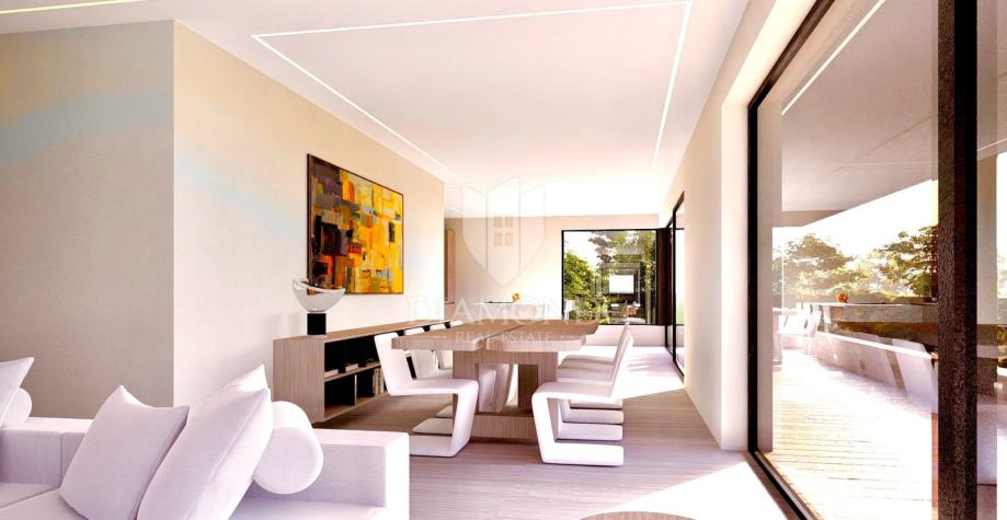 Na svojih 153,35 m2 neto površine stana nalazi se prostrani dnevni boravak s blagovaonicom i kuhinjom, četiri spavaće sobe, dvije kupaonice, wc, tehnička soba i vešeraj. Glavna spavaća soba ima svoju kupaonicu i garderobu. Iz dnevnog boravka staklena stijena sa sjenilima dugačka čak 6 metara omogućava izlaz na natkrivenu terasu veličine 36 m2. U posjedu stana je i krovna terasa od čak 190 m2 sa jacuzzijem.
