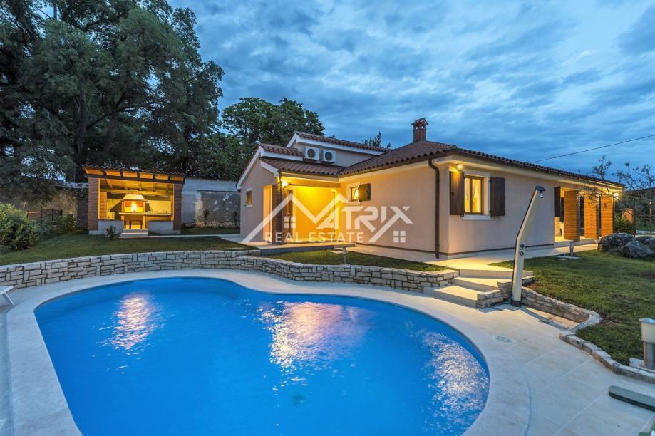 Prodaje se ova prekrasna prizemnica s bazenom, potpuno opremljena i namještena kako je vidljivo na slikama, ukupne stambene površine 156 m2. Kuća se nalazi u mirnom naselju, u blizini svih sadržaja, pružajući idealnu kombinaciju luksuznog života na mirnoj lokaciji. Kuća se vrlo uspješno iznajmljuje tijekom ljetnih mjeseci, što otvara i mogućnost preuzimanja već uhodanog posla.
