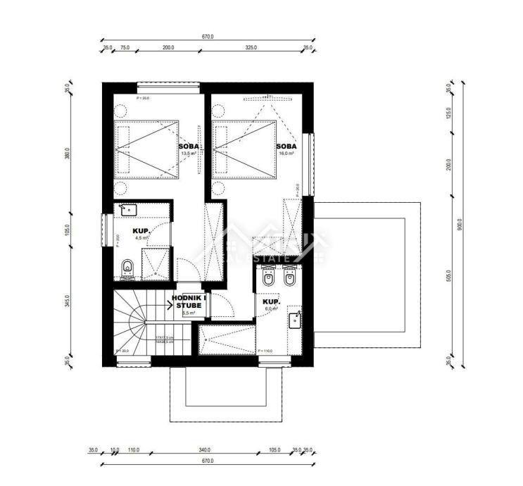 Kuća zauzima velikodušnu parcelu od 501 m², a prostire se na dva pažljivo osmišljena kata. Prizemlje čini srce doma, s privlačnim ulaznim hodnikom koji vodi u prostrani dnevni boravak, kuhinju i blagovaonicu – savršeno za obiteljska okupljanja ili uživanje u mirnim trenucima. Gostinjski toalet i spremište dodatno povećavaju funkcionalnost ovog nivoa.