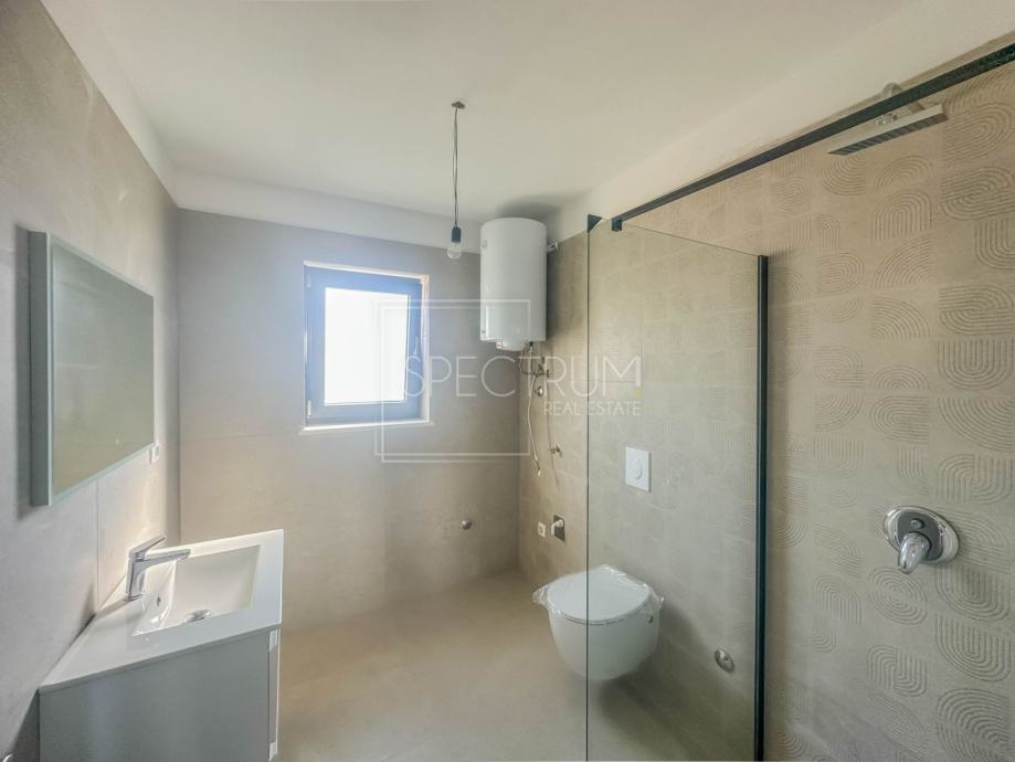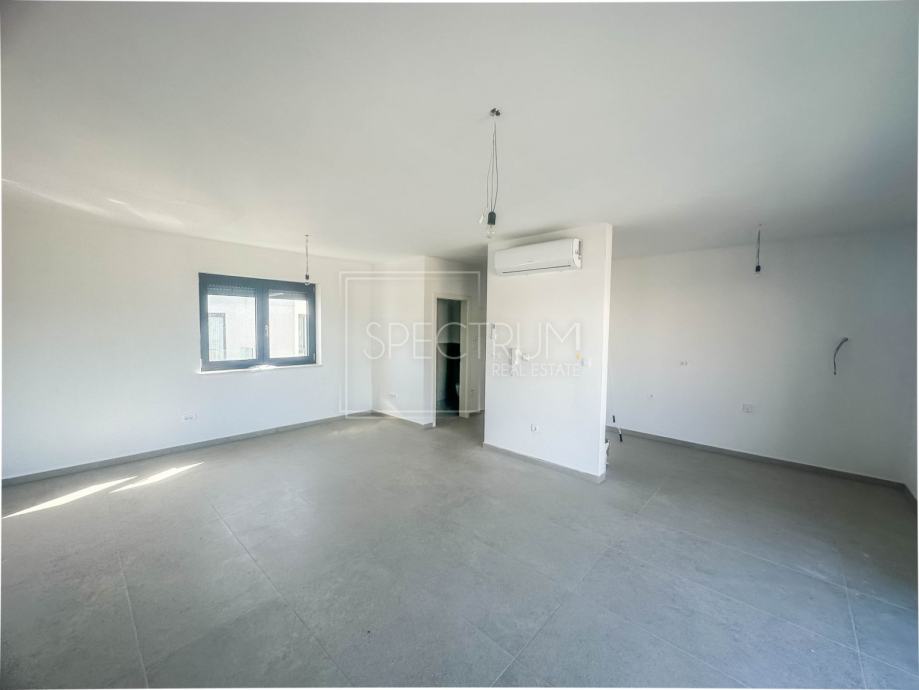 Stan se nalazi na 1.katu stambene zgrade sa 4 stambene jedinice. Površina stana iznosi 87 m2. Stan se sastoji od prostranog dnevnog boravka sa kuhinjom i blagovaonicom, 3 spavaće sobe, kupaonice, wc-a, hodnika, spremišta i balkona. Stanu pripada krovna terasa površine 86 m2. Na krovnoj terasi se već nalaze spremni priključci i odvodi za ugradnje ljetne kuhinje i hidromasažnog bazena. Sa krovne terase se pruža otvoreni pogled na prirodu. Stan se grije putem klima uređaja i podnog grijanja na struju. Zgrada ima i dimnjak, pa postoji mogućnost i ugradnje peći na drva. Stan se prodaje u fazi ključ u ruke (završeni podovi i sanitarije, bez namještaja). U gradnji su korišteni vrlo kvalitetni materijali. Ispred ulaza u zgradu nalazi se parking.