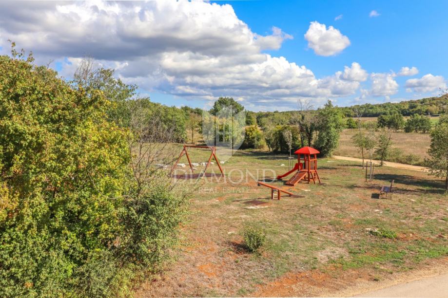 U prizemlju se nalazi prostrani dnevni boravak, blagovaona, kuhinja koja ima izlaz na natkrivenu terasu i ljetnu kuhinju, jedna spavaća soba i kupaona. Vanjskim se stubištem dolazi na prvi kat u kojem se nalaze još tri spavaće sobe i dvije kupaone sa prostranom i natkrivenom terasom sa pogledom na bazen i prirodu kojom je kuća okružena. Veličina bazena je 32 m2.