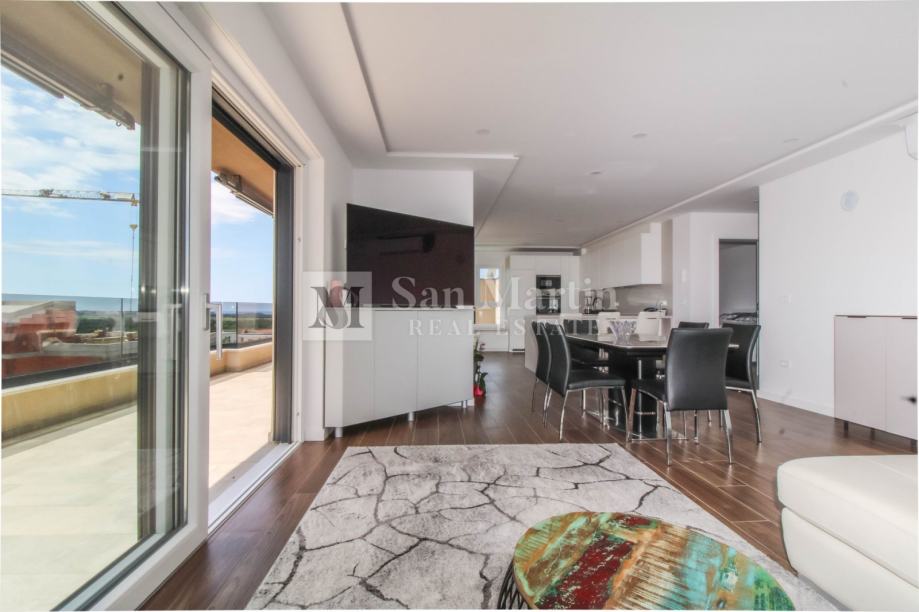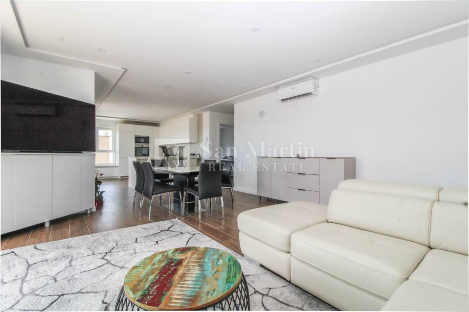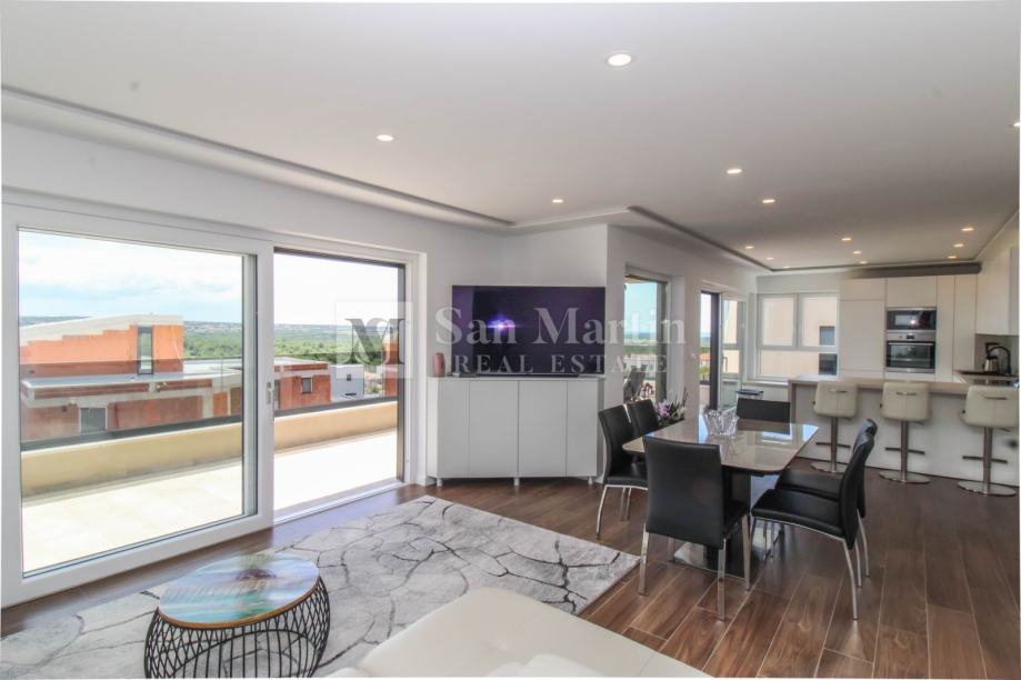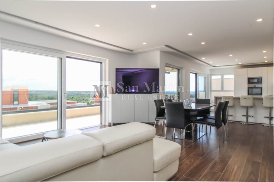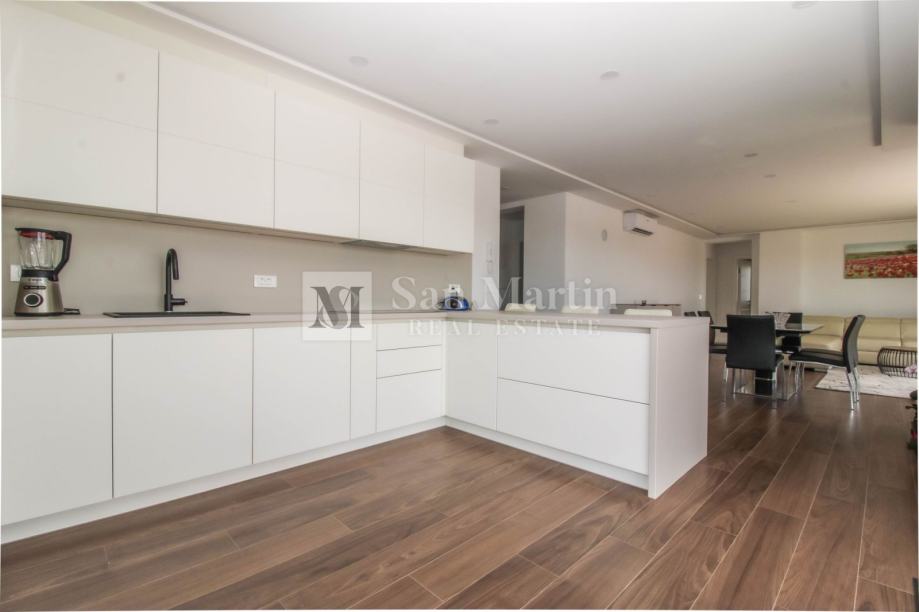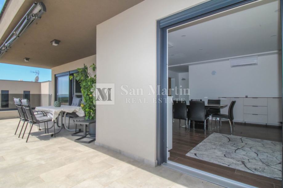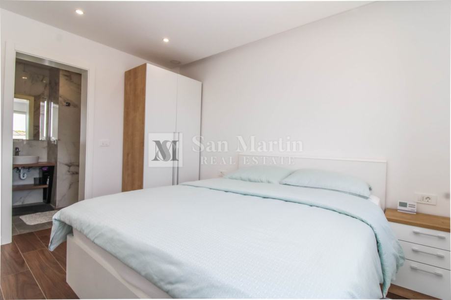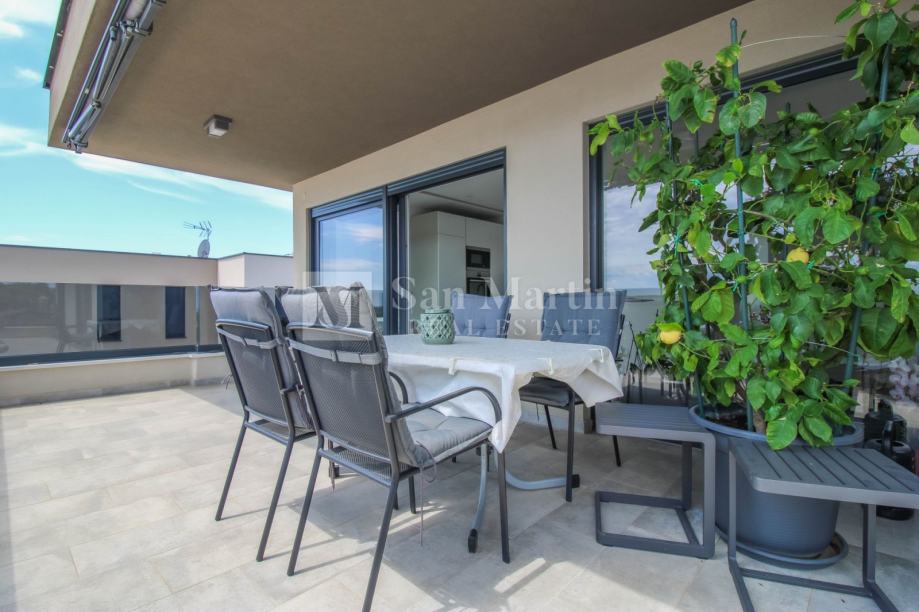 Stan se smjestio na drugom katu manje stambene zgrade. Ukupna površina nekretnine je 105 m2 koja se sastoji od prostranog osunčanog dnevnog boravka sa kuhinjom i blagovaonom open - space koncepta sa izlazom na veliku natkrivenu terasu sa koje se pruža prekrasan pogled na more i okolicu. Tu su i tri spavaće sobe sa vlastitim kupaonama. Jedna od spavaćih soba ima vlastiti izlaz na terasu.