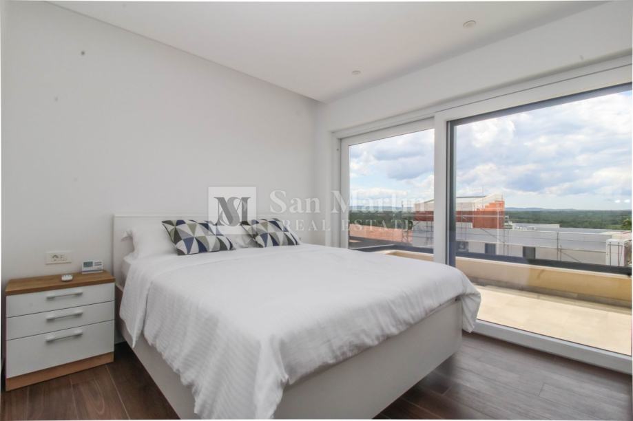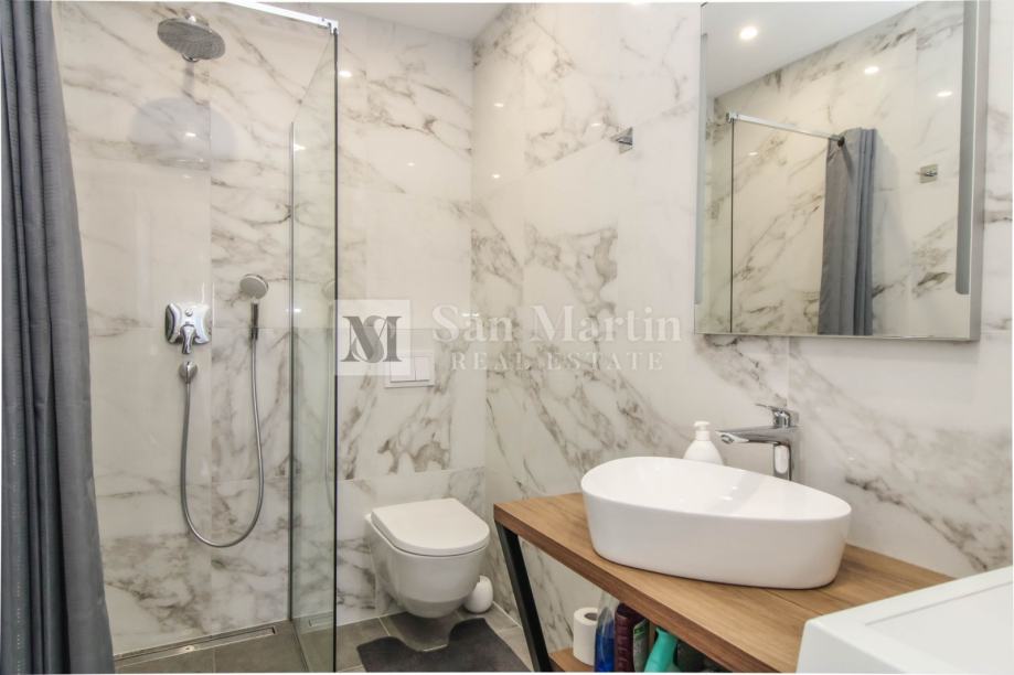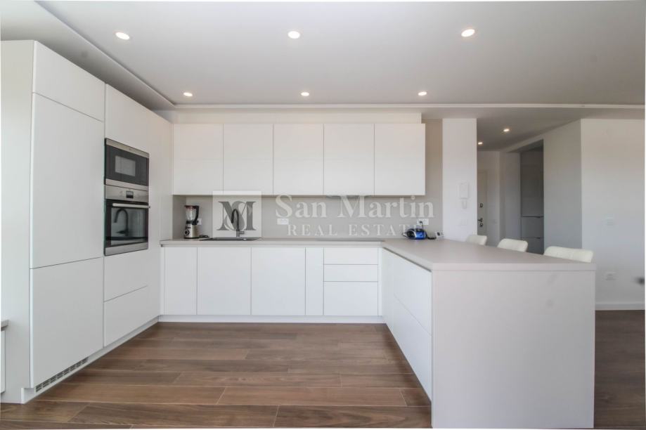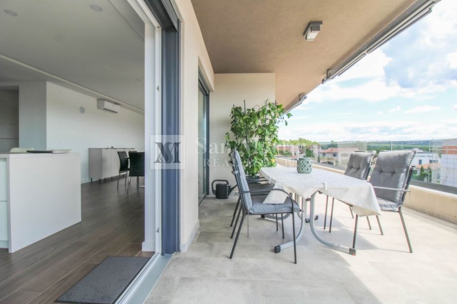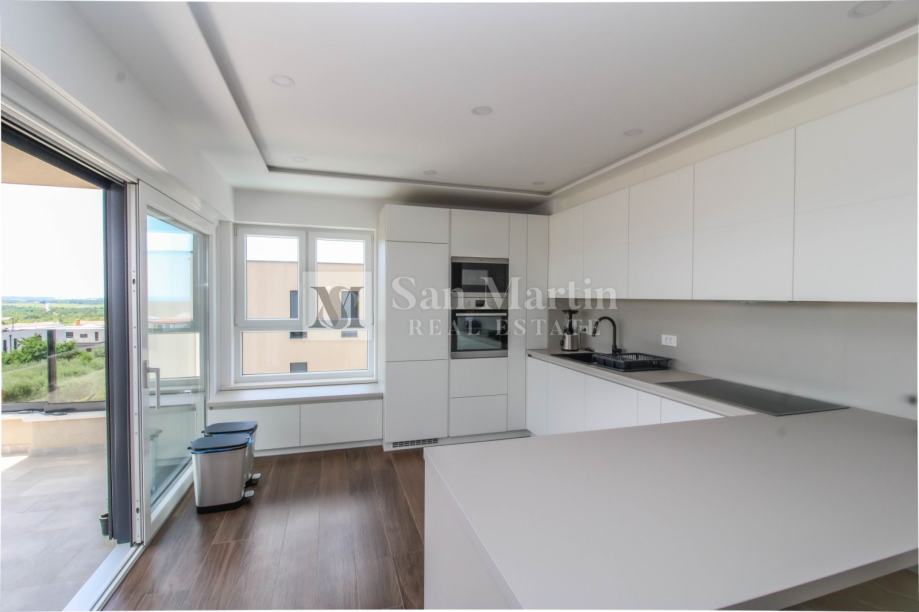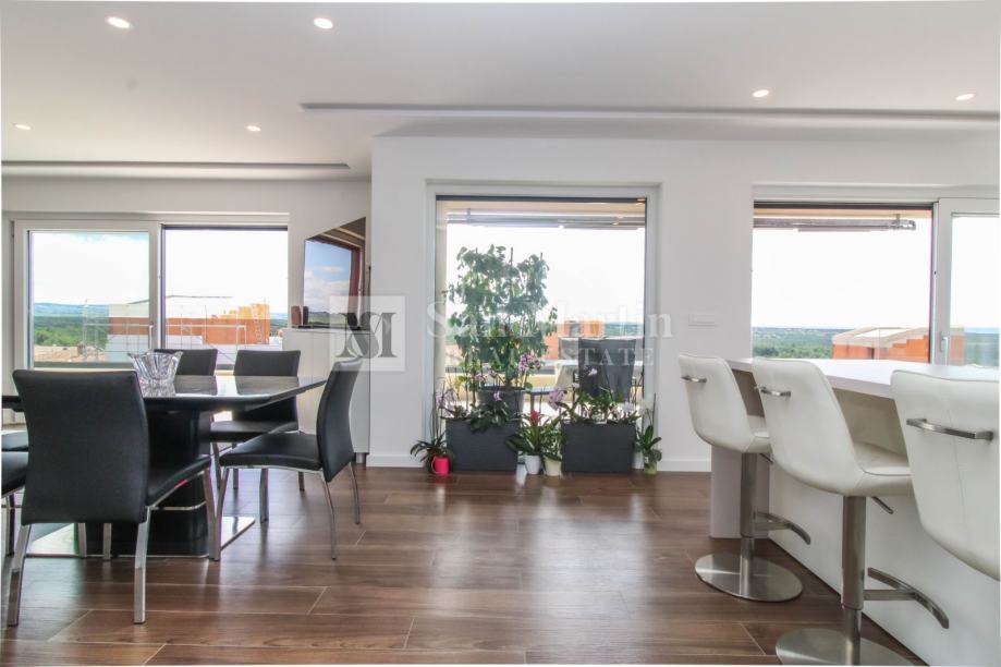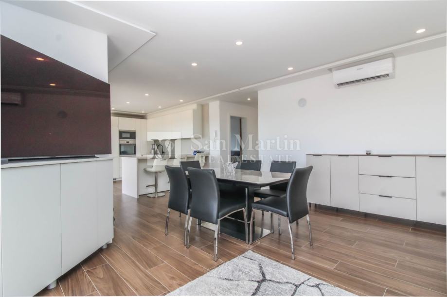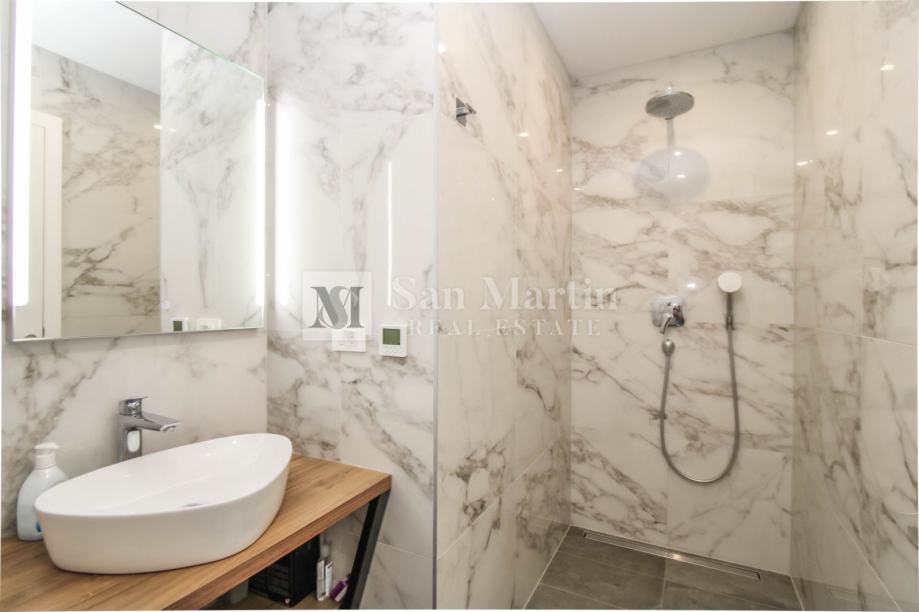 Stan se smjestio na drugom katu manje stambene zgrade. Ukupna površina nekretnine je 105 m2 koja se sastoji od prostranog osunčanog dnevnog boravka sa kuhinjom i blagovaonom open - space koncepta sa izlazom na veliku natkrivenu terasu sa koje se pruža prekrasan pogled na more i okolicu. Tu su i tri spavaće sobe sa vlastitim kupaonama. Jedna od spavaćih soba ima vlastiti izlaz na terasu.