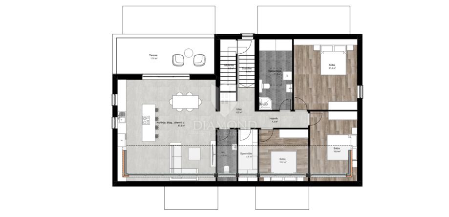 Ovaj fantastičan obiteljski stan se nalazi na drugom katu te će se sastojati od dnevnog boravka, blagovaone i kuhinje po open space konceptu, tri spavaće sobe ,