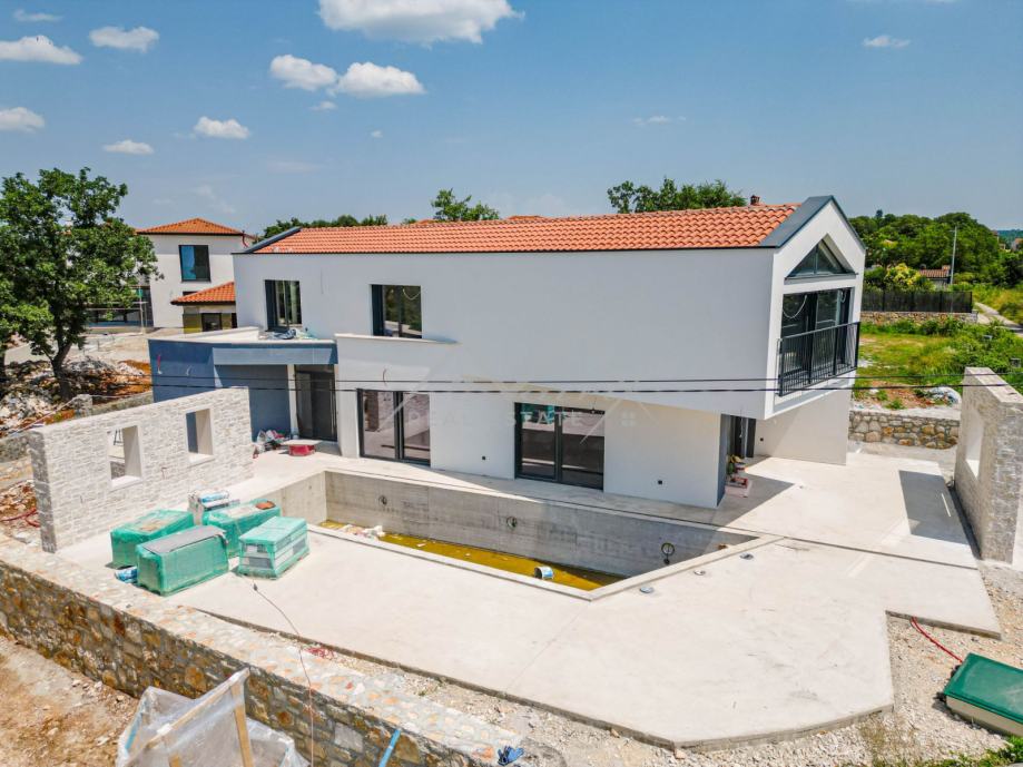 Iz dnevnog boravka i blagovaonice možete direktno izaći na natkrivenu terasu, gdje vas čeka ugodan bazen. Područje bazena pruža slikovit pogled na bujno zelenilo, nudeći mirno utočište za opuštanje i uživanje. Grijanje cijele vile na obje etaže omogućeno je podnim grijanjem putem dizalice topline, nadopunjeno klima uređajima u svakoj prostoriji za personaliziranu udobnost.