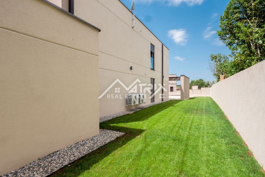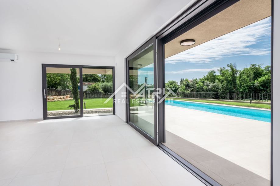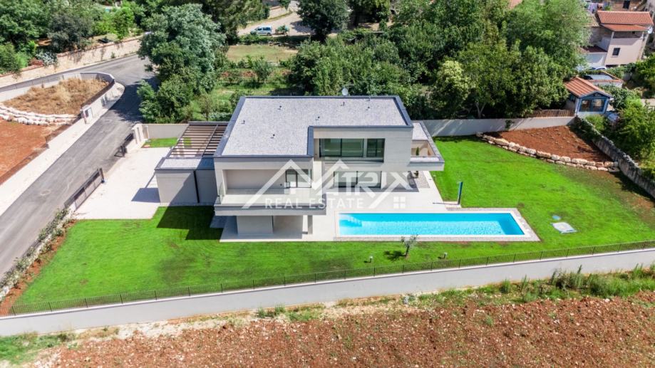 bazen od 50 m2. Vila ima i veliku uređenu okućnicu u kojoj će se posaditi 3 masline koje su karakteristične za podneblje Istre. Do kuće u dvorištu se nalazi