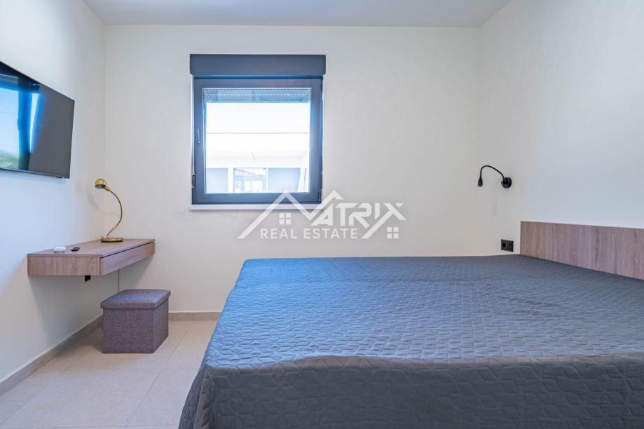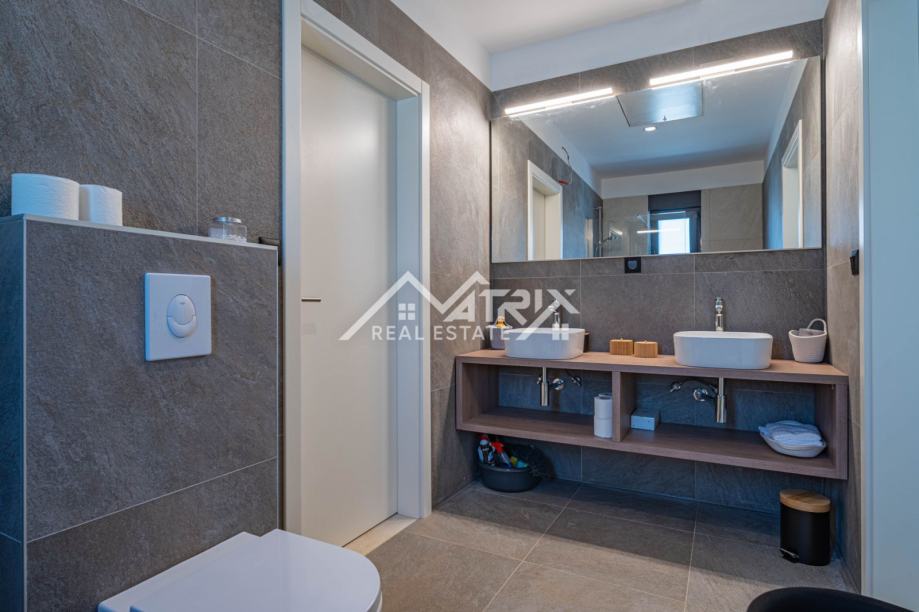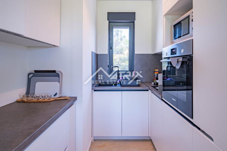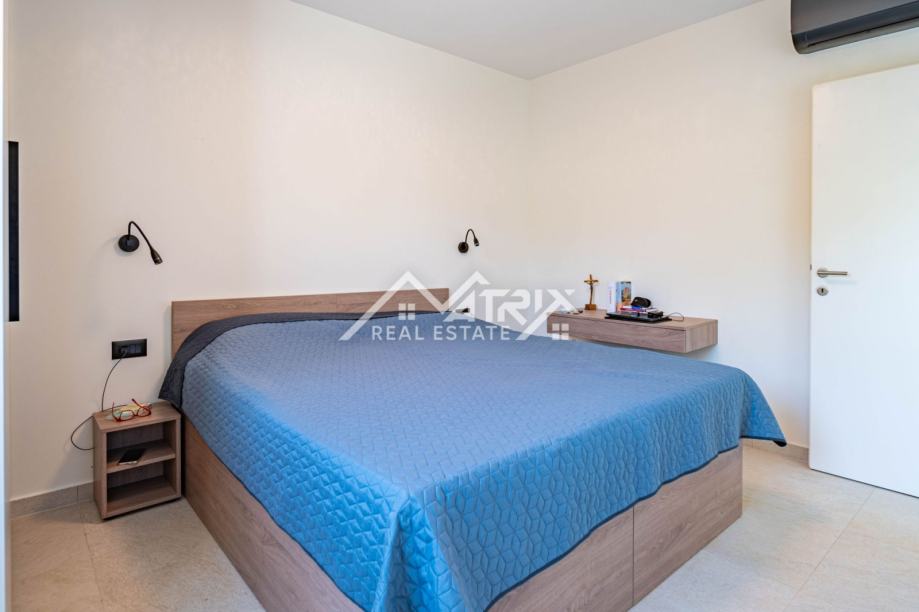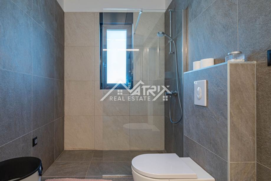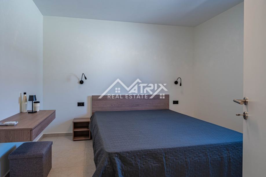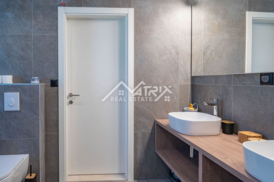 Vanjski prostor jednako je impresivan, s blistavim bazenom i sunčalištem koje poziva na opuštanje pod istarskim suncem. Natkrivena vanjska kuhinja i blagovaonica pružaju savršen prostor za blagovanje na otvorenom i zabavu, uz pozadinu slikovitog istarskog maslinika. Nekretnina je potpuno ograđena tradicionalnim suhozidom, osiguravajući privatnost i sigurnost, dok je uređen vrt opremljen sustavom navodnjavanja i vanjskom rasvjetom, čime se dodatno poboljšava ljepota i funkcionalnost prostora. S dva osigurana parkirna mjesta i najmodernijim sustavom klimatizacije, svaki je detalj pažljivo osmišljen kako bi pružio životno iskustvo koje je i luksuzno i održivo.