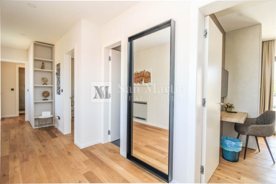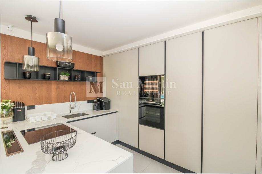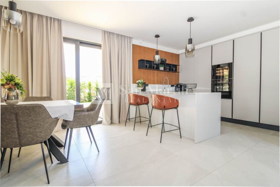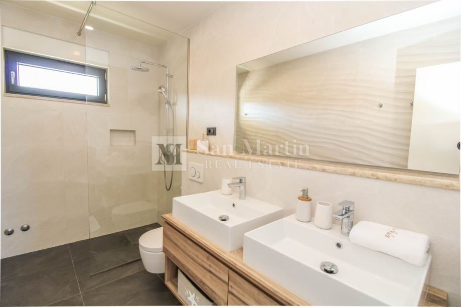 U prizemlju kuće su smješteni dnevni boravak, kuhinja i blagovaona otvorenog koncepta te kupaona i ostava. A na katu su tri spavaće sobe i dvije kupaone te stepenište koje vodi na krovnu terasu sa koje se pruža fenomenalan pogled na more.