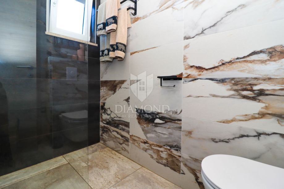 Kuća se prostire na dvije etaže te se sastoji od prostranog dnevnog boravka, kuhinje i blagovaonice po open space konceptu, ostave, četiri komotne spavaće sobe, dvije sobe sa vlastitom kupaonom. Unutar kuće nalazi se prostrani dnevni boravak, elegantno uređen i ispunjen prirodnom svjetlošću zahvaljujući velikim prozorima. Kuhinja, potpuno opremljena i moderno dizajnirana, predstavlja srce doma i idealno je mjesto za pripremu obroka za obitelj i prijatelje. Blagovaonica pruža dovoljno mjesta za udobne obiteljske večere.