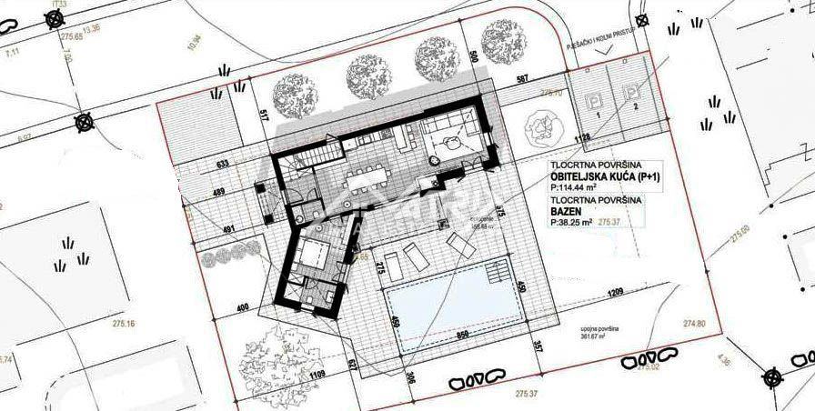Trenutno je u tijeku postupak dobivanja građevinske dozvole za izgradnju prekrasne obiteljske kuće s bazenom. Planirani objekt imat će ukupnu stambenu neto površinu od 115 m2 s bazenom površine 38 m2. Projekt i komunalni doprinosi su već plaćeni, tako da se očekuje da će sva dokumentacija potrebna za početak gradnje biti uskoro gotova.