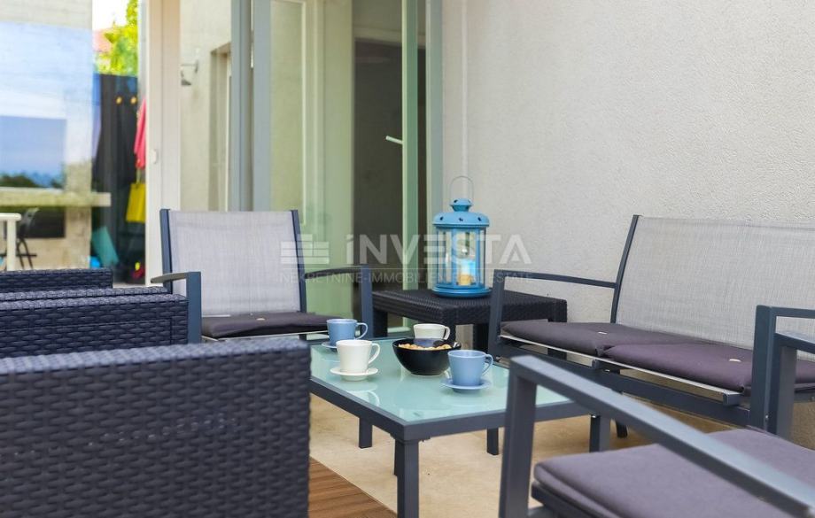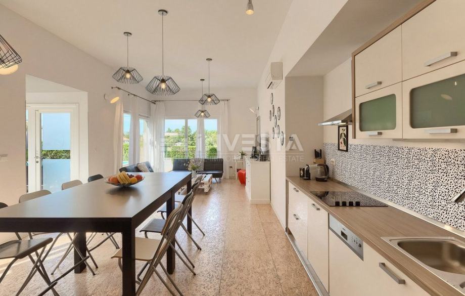 Stakleni hodnik povezuje oba dijela kuće te pruža direktan pristup terasama – s jedne strane smještena je ljetna kuhinja i prostor za objedovanje na otvorenom, dok se s druge strane nalazi dvorište s bazenom površine 24 m² i sunčalištem idealnim za potpuni odmor i privatnost.