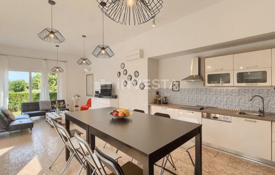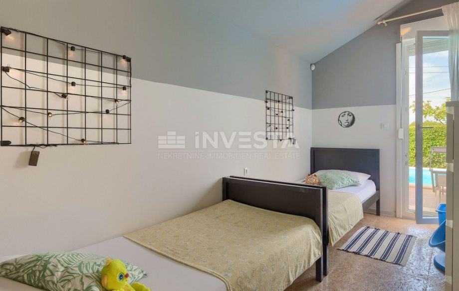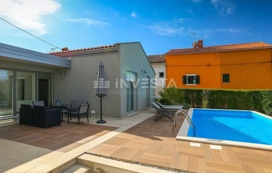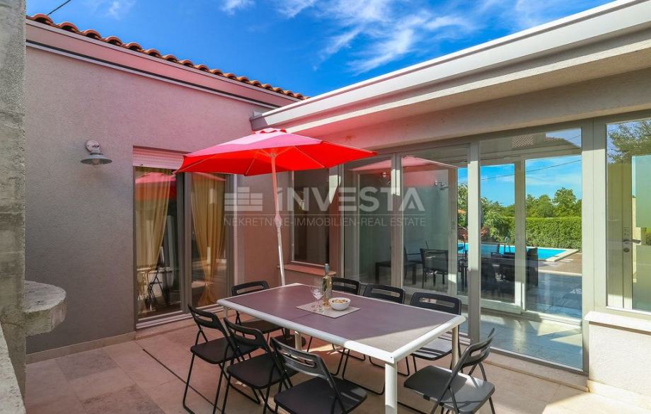 Na mirnoj lokaciji, okružena zelenilom i autentičnim istarskim ambijentom, smjestila se ova jedinstvena prizemna vila površine 147 m2 na zemljištu od 324 m2 čiji je tlocrt oblikovan u prepoznatljivom obliku slova H.