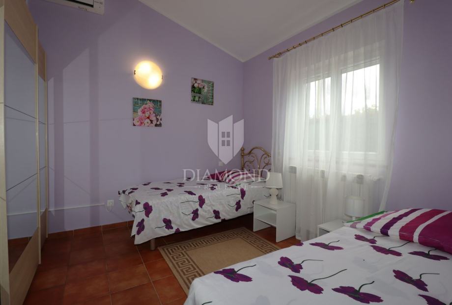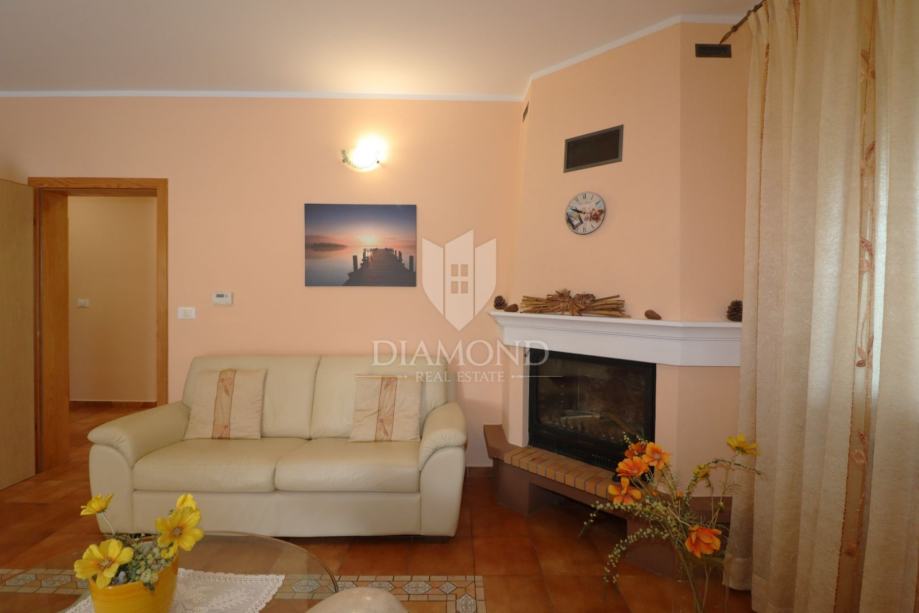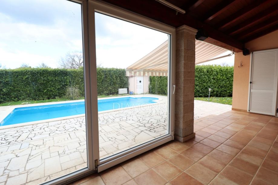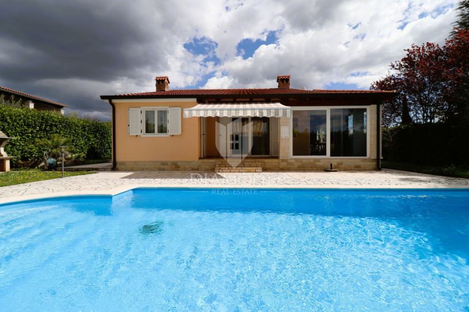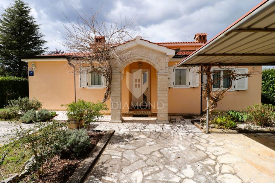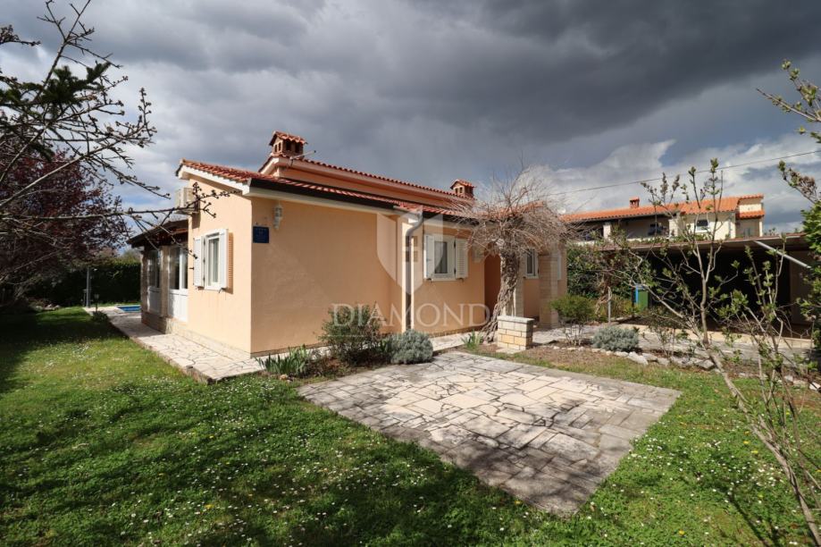 Na samo nekoliko minuta vožnje od Poreča, u mirnom okruženju udaljenom približno 8 km od mora i centra grada, smještena je šarmantna prizemnica s bazenom i garažom, ukupne površine 116 m². Izgrađena 2008. godine, kuća se nalazi na lijepo uređenoj i potpuno ograđenoj parceli površine 761 m² koja osigurava potpunu privatnost.